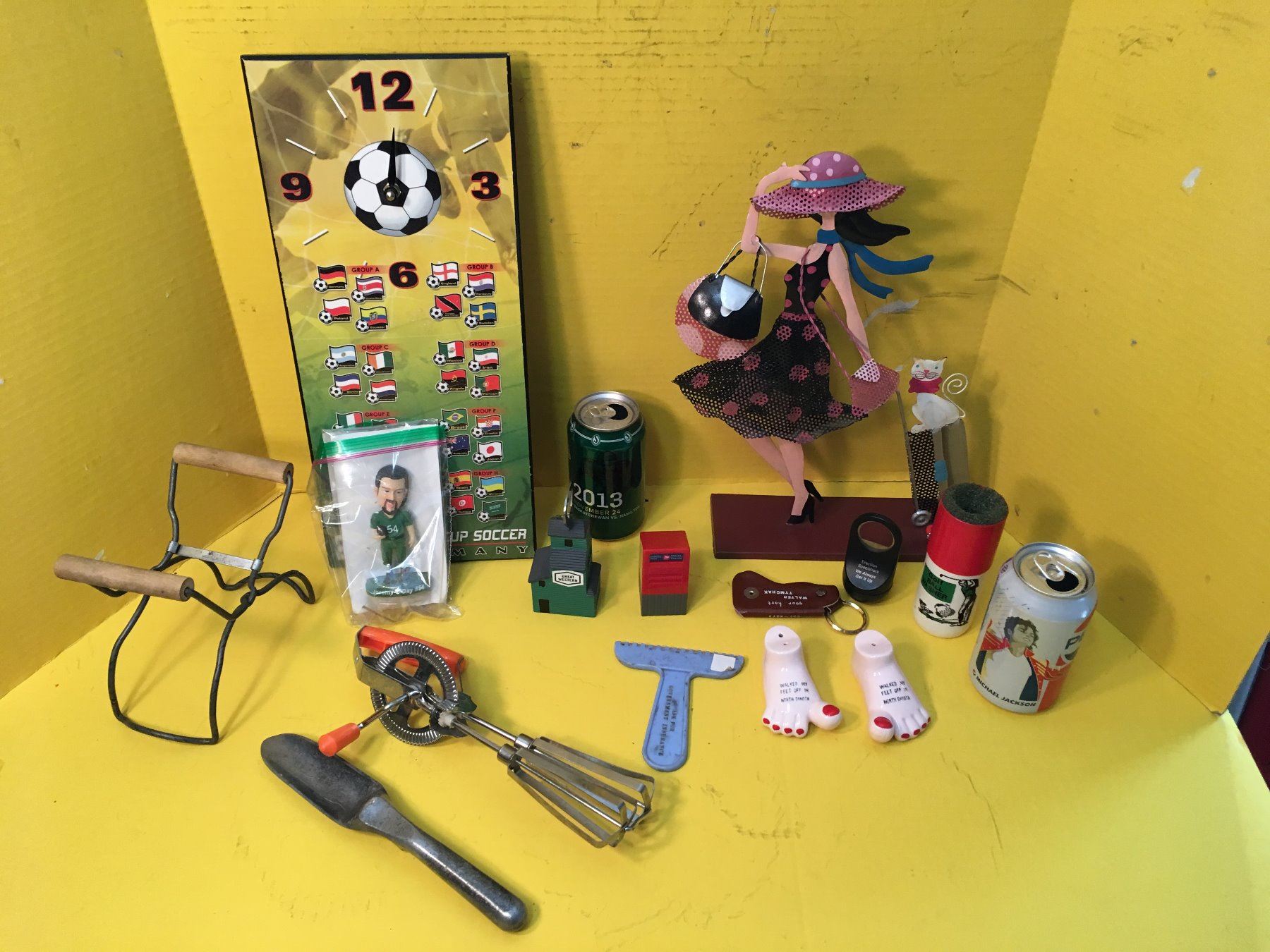15 MISC METAL ITEMS, WOMAN SHOPPING, ETC