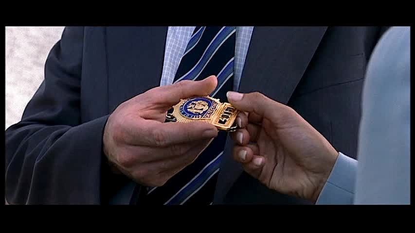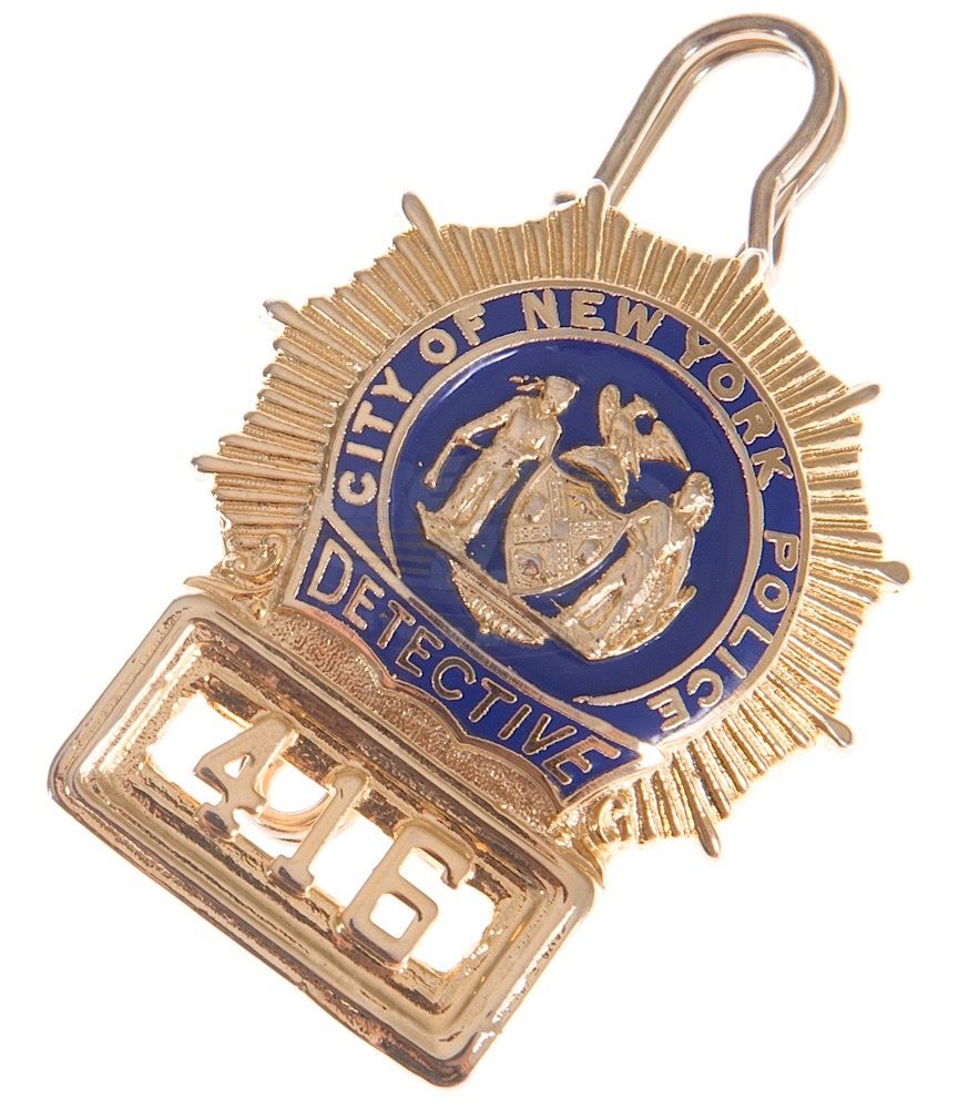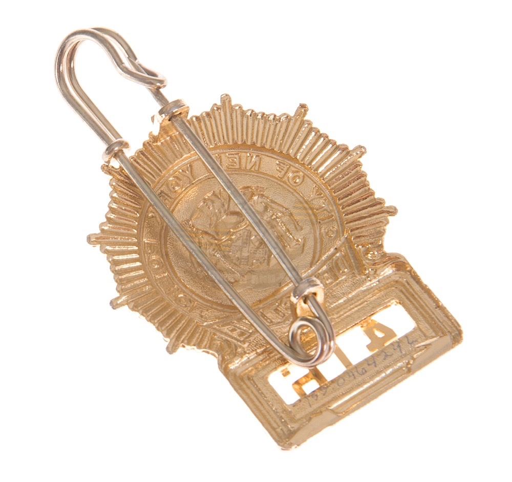 (New Line Cinema, 2001) This prop badge was acquired by the production for use by Robert De Niro as "Detective Eddie Flemming". The badge is made of metal and features the "City Of New York Police Detective" crest and the number "416". A large pin is present on back for attaching to his costume. Measures 2.5" x 2".