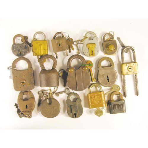 15 Misc. Padlocks including a Army Pancake Style, Miller, Heart Shaped, Union and a Barrel. Various sizes and conditions, all have keys.