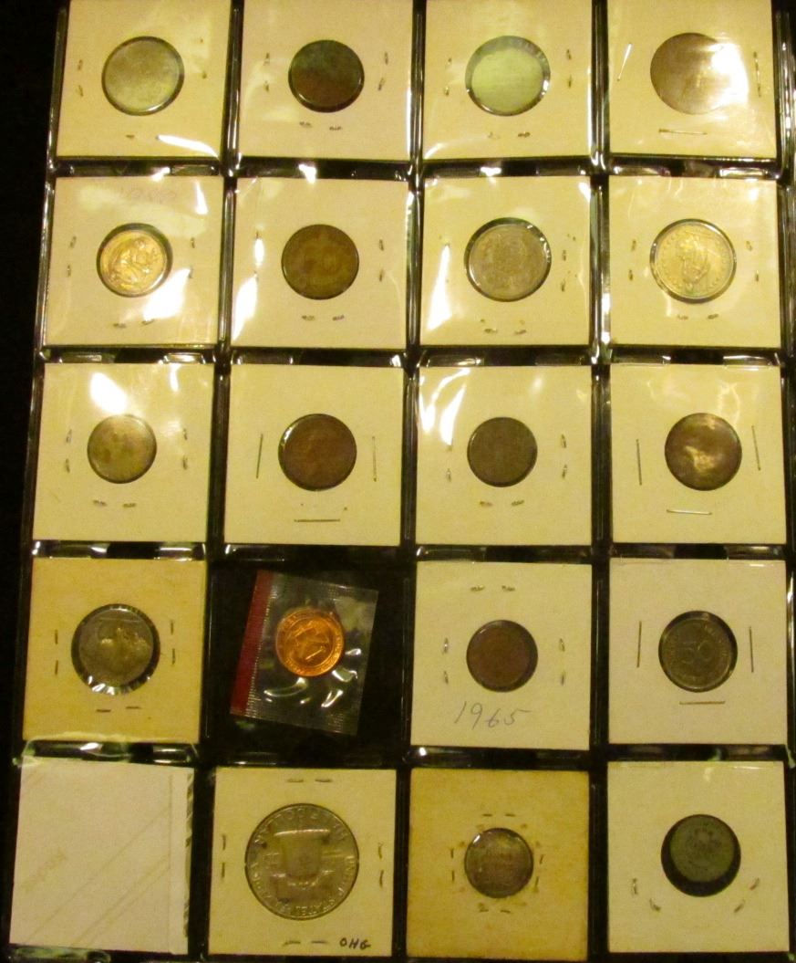 (15) Mixed Foreign Coins & Medals; 1916 P Buffalo Nickel; 1907 P Barber Dime; 1857 Seated Dime (damaged); & 1961 D Franklin Half Dollar, Unc.