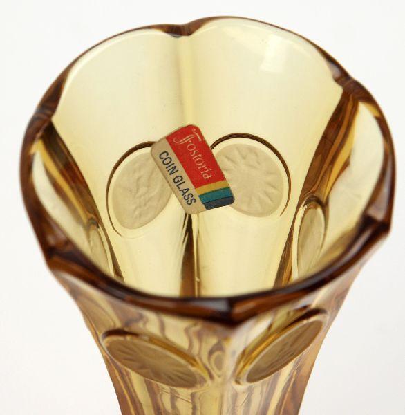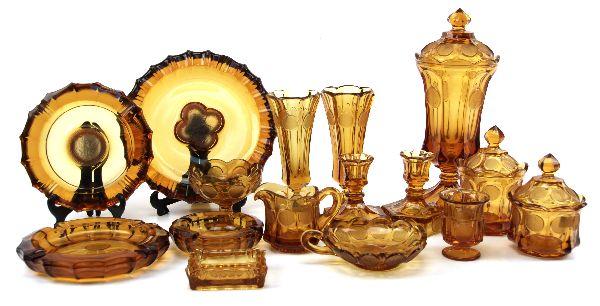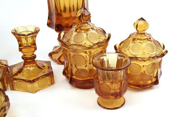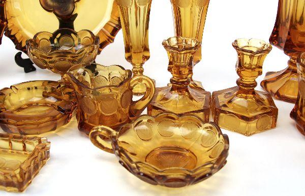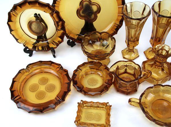 A nice grouping of Fostoria Coin pattern glassware in amber. Pieces include: 13 inch covered urn, (2) 8 inch vases, (2) 4.5 inch candle holders, 3.75 inch jelly dish, 3.5 inch cordial glass, 5 inch handled nappy, 3 inch creamer, 5.5 inch covered sugar, 5