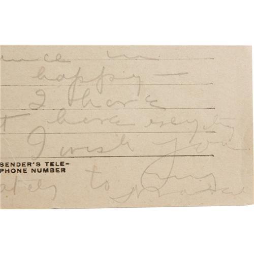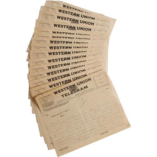 <B>15-Page Hand-Written Letter by Mabel Normand to Her Doctor After an Apparent Breakdown.</B></I> A sad, rambling and very touching letter, written by Mabel in pencil on Western Union telegram paper (15 sheets) to her physician, Dr. Fulton. The letter was written at a time that Mabel was suffering both physical and emotional distress, and had been a patient at Good Samaritan Hospital in Los Angeles. Her trusted Dr.Fulton apparently had taken a cruise to Alaska, and Mabel desperately writes to him about her other physicians, noting, "God only made one Dr. Dudley Fulton,so my opinions of the rest I could write line one little sentence of french sic ..." Mabel writes of "dreadful painful nights" and of observing mothers with their babies - "those lovely young mothers who taught me a great lesson, and their sincereness sic in loving something thats sic part of them will make a tremendous difference in my work..." (Mabel had no children.) She ends the letter, "I wish you were home affectionately to my only Dr. Fulton Mabel." There are various tiny tears in the 15 pages, otherwise they're in overall Very Fine condition. This is a truly intimate and very moving piece, giving insight into the private torments of Mabel Normand. <I>Accompanied by LOA from PSA/DNA.</B></I><BR><BR><b>Shipping:</b> Flat Material, Small (<a target="_blank" href="http://www.heritageauctions.com/common/shipping.php">view shipping information</a>)