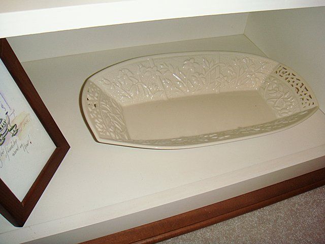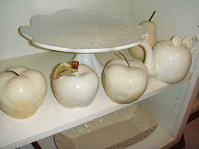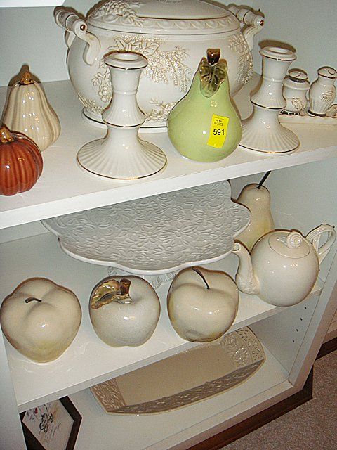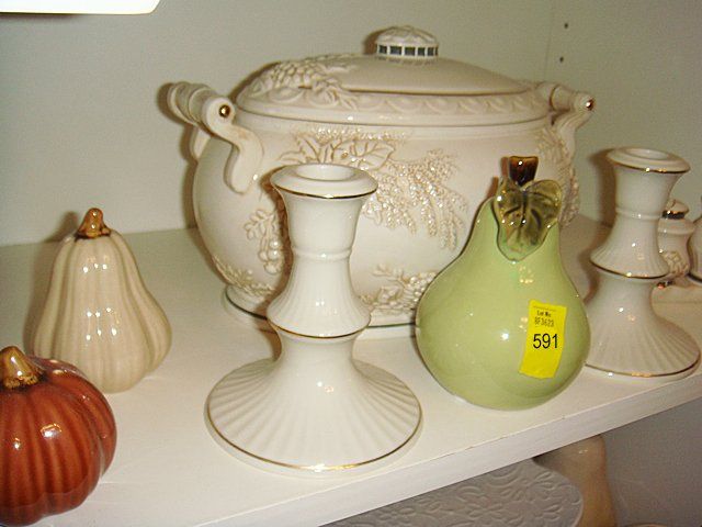 15 Piece Estate Lot including Lenox Candle Holders, covered Tureen, salt and pepper, assorted fruit, Studio Nova cake server, Leedsware decorative tea pot with interesting intertwined handle and flower top, and Lenox Jasmine Tray.