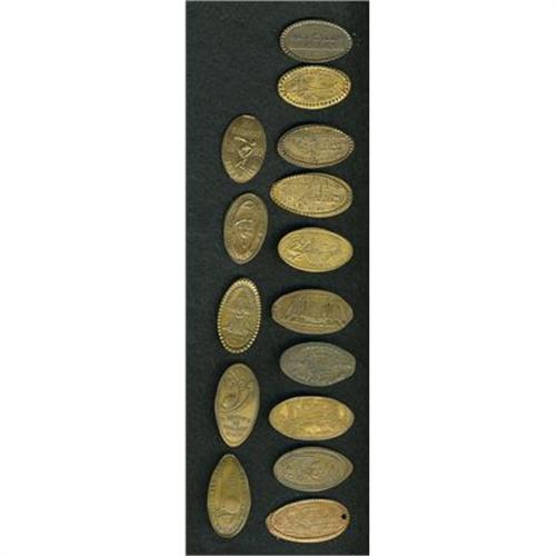 <B>15-Piece Lot of Elongated Cents.</B></I> Copper. Outstanding group lot of elongated cents including: Will Rogers<B> OFP-11, ILL-CPIE-32, N.Y.-PAE-7a, CALala-2a</B></I>, plus more dating from 1904 to 1939.<BR><BR><b>Shipping:</b> Coins & Currency (<a target="_blank" href="http://www.heritageauctions.com/common/shipping.php">view shipping information</a>)