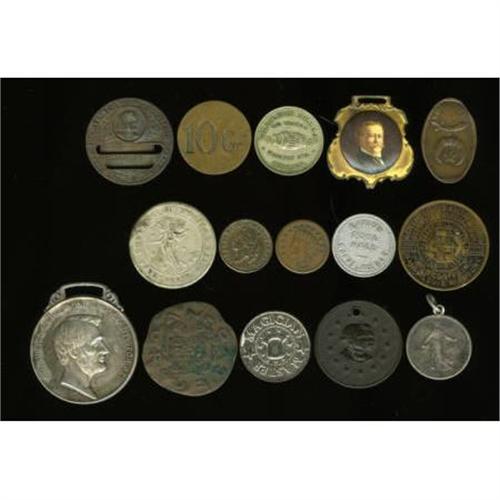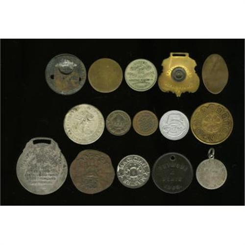 <B>15-Piece Lot of Political, Merchant, Love Tokens.</B></I> Wide range of material from a Lincoln vintage watch fob to a World War I sweetheart coin/love token, a hard rubber 1868 Seymore & Blair political medal, many more.<BR><BR><b>Shipping:</b> Coins & Currency (<a target="_blank" href="http://www.heritageauctions.com/common/shipping.php">view shipping information</a>)