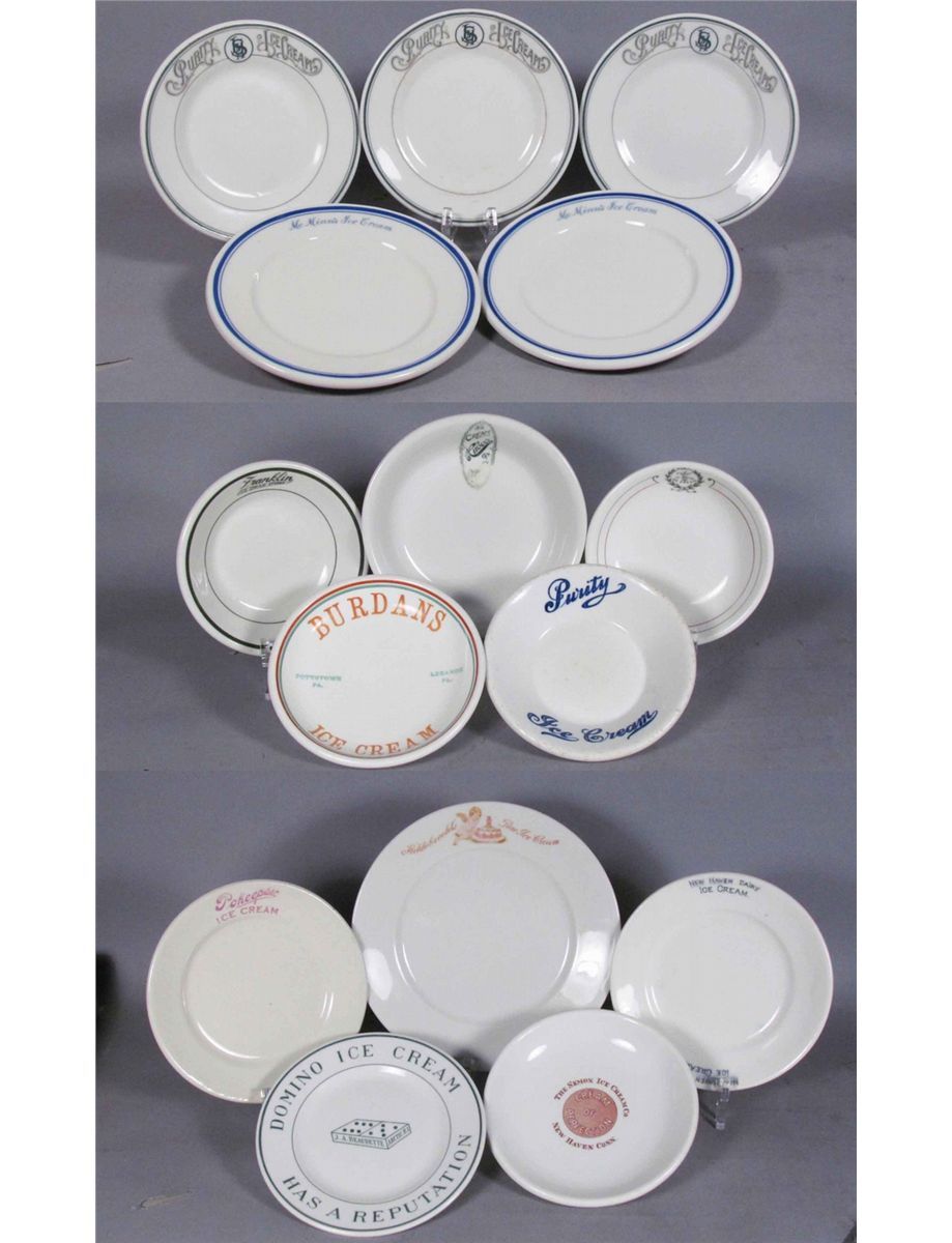 15 Pieces of Misc. Ice Cream Restaurant Ware. Plates and bowl include Domino, Pokeepsie, Purity, Franklin and more. Largest dish measures 7 1/2 inches diameter.