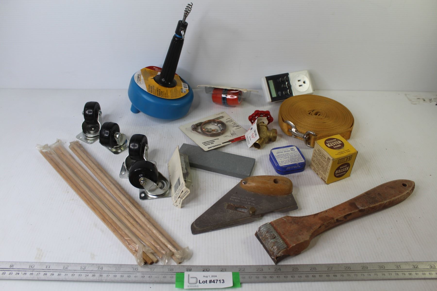 15' Plastic Drum Auger - TRoberts Cushion Back Cutter - Strapping - Boiler Drain Tap - Scraper - (4) Cart Wheels - Sticks - Misc. Items