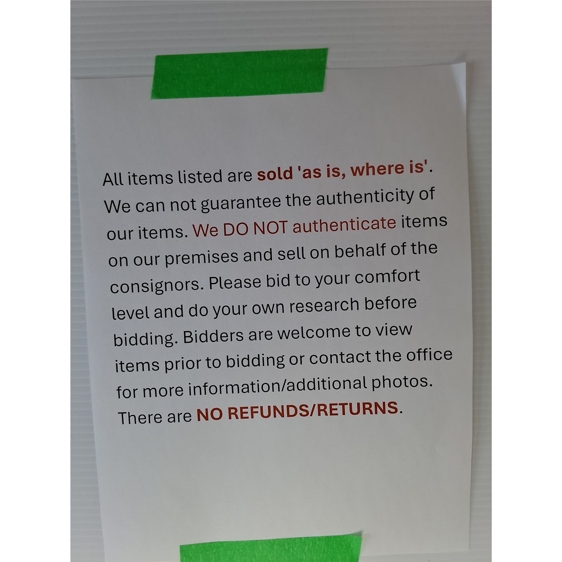 If you are wanting to hold on items for another auction coming up, let us know within 24 hours (maximum hold: 2 auctions). Please give 15 to 30 days for items to be collected, packed, payment processed and shipped out.