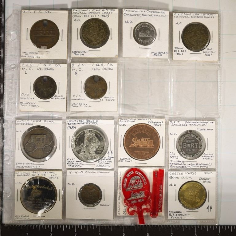 FARGO KEYCHAIN, HOUSTON BELT TERMINAL RY CO. TRANSCONTINENTAL RAILROAD TERMINUS, B.R.T. BROTHERHOOD OF RAILROAD TRAINMEN, RAILROAD PASS CASINO HIGHWAY 93 & 95 LAS VEGAS, 4-4-0 STEAM ENGINE, BROKEN STIR STICK, CASTLE PARK