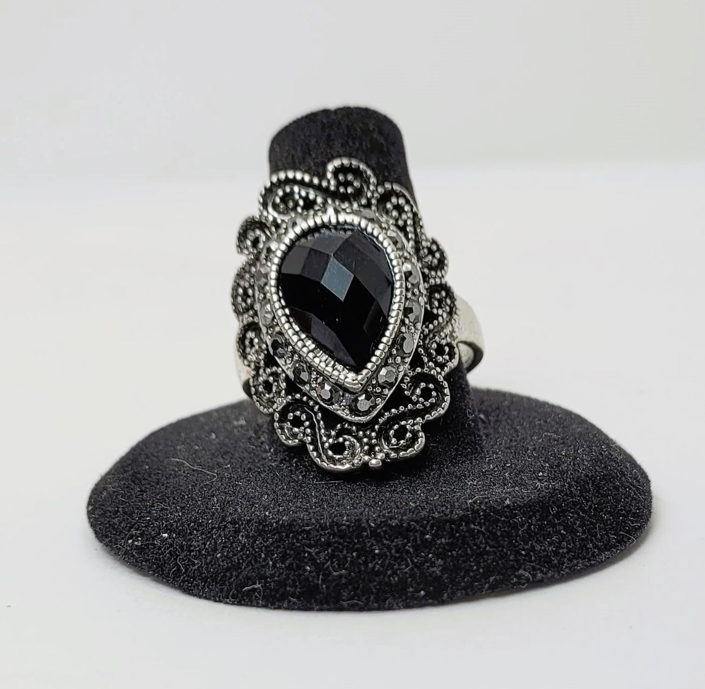 INTRICATE OPEN WORK FILIGREE AND A BLACK CHECKERBOARD CRYSTAL RING, SIZE 10. JEWELRY