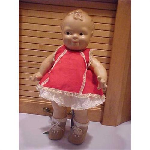 This composition doll was made by Cameo but designed by Rose O'Neill. The doll is in remarkable condition for its'age. I found no distracting marks and no damage or repairs. It must not have been played with very much. I am sure the panties are replaced old ones but I don't know about the clothes. They fit and seem appropriate. The smaller Scootles came in sunsuits but this is the more rare larger version and it came in a dress but I don't know if this is the one. I think the dress is silk and has a few small holes--see picture but the holes seem to add to her charm. This doll is great.