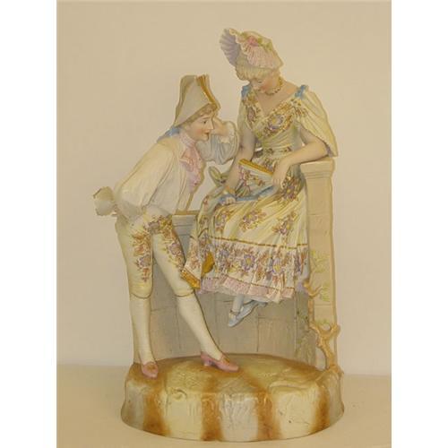 15" VICTORIAN BISQUE FIGURINE OF VICTORIAN COURTING COUPLE ON MOTTLED BASE-UNSIGNED - REPAIR TO WOMEN'S HEAD AT NECK, CRACK IN WRIST OF MAN, IMPERFECTIONS