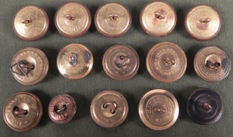 15 VINTAGE BRITISH MILITARY BUTTON COLLECTION-MOST MAKER MARKEDSOME MAKERS: GAUNT-LONDON---W. DOWLER & SON-BIRMINGHAM---J R GAUNT & SON-LONDON---FIRMIN-LONDON---FIRMIN & SONS LTD-LONDON---C H C & S-BIRMINGHAM---WILMOT-BREEDEN LTD-BIRMINGHA
