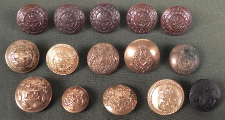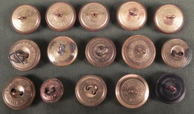 15 VINTAGE BRITISH MILITARY BUTTON COLLECTION-MOST MAKER MARKEDSOME MAKERS: GAUNT-LONDON---W. DOWLER & SON-BIRMINGHAM---J R GAUNT & SON-LONDON---FIRMIN-LONDON---FIRMIN & SONS LTD-LONDON---C H C & S-BIRMINGHAM---WILMOT-BREEDEN LTD-BIRMINGHAM