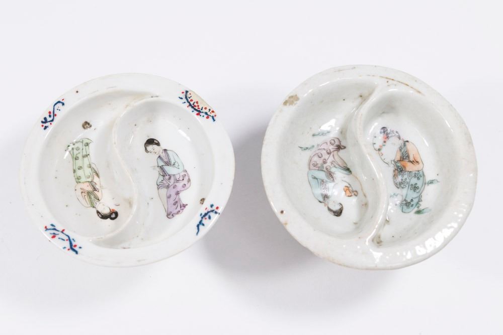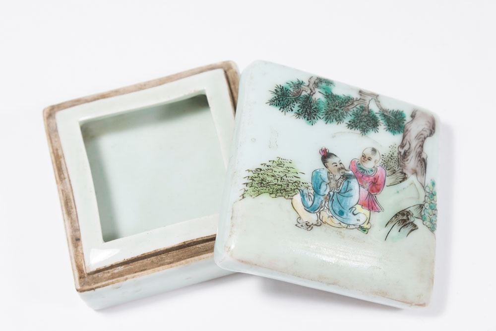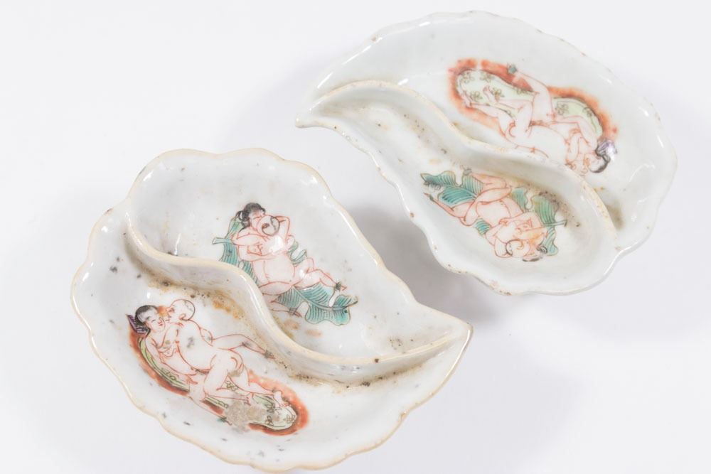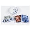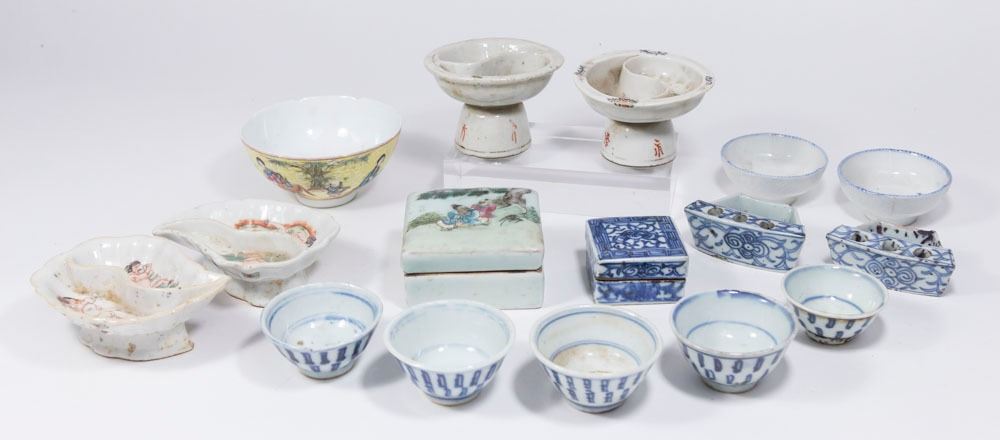 Including pair erotica leaf bowls, pair blue & white candle holders, 7 sake cups, 2 covered boxes, and more. Various sizes.