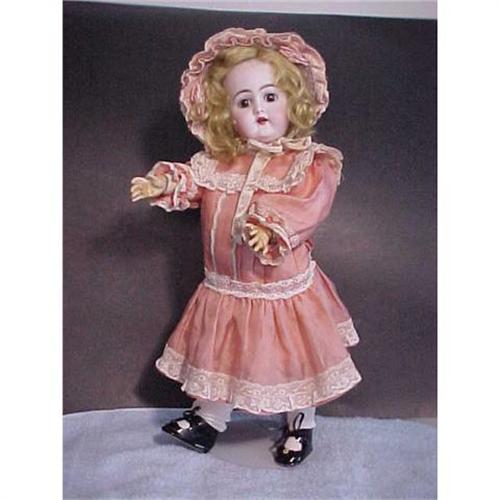 This cabinet sized doll is really cute. She is marked 89/7 which is probably Handwerck. Her bisque head has no damage or repairs. She has brown sleep eyes with fairly good wax on lids. Her painting is gorgeous. The composition body has play wear but is sturdy and all fingers are present. The wig is probably original but the clothing is not. She looks adorable when displayed. She has earrings and the holes have teeny roughness to edges. Dress and bonnet match and appear to be silk--lovely color on her. She is so sweet and priced right.