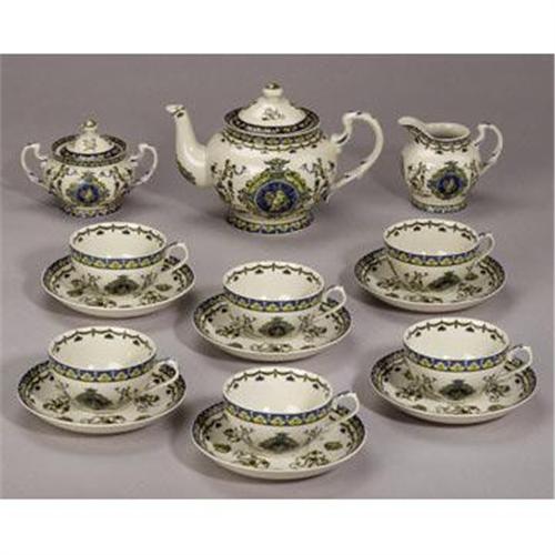 Multi-colored transferware porcelain features cherub medallion with blue border that has yellow leaf trim. Lids are removable. Dimensions: Teapot:6.5"h, 9"w, 5.5"d; Creamer:4"h, 4"w, 3.5"d; Sugar:4"h, 6"w, 4"d; Cup:2"h, 4.5"w, 4"d;