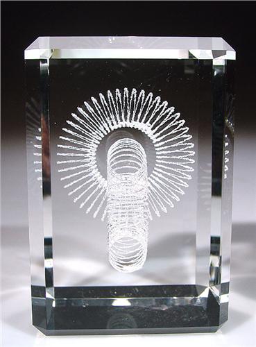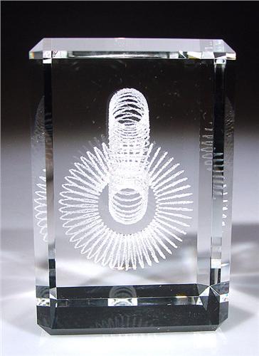 Laser Light "Interlocking Rings" Artist Proof laser design block-shaped crystal paperweight. The piece contains a three-dimensional laser design of a pair of interlocking rings. Designed by Ed Nesteruk, of Pennsylvania Art Glass. Height 3", width 2". NO RESERVE