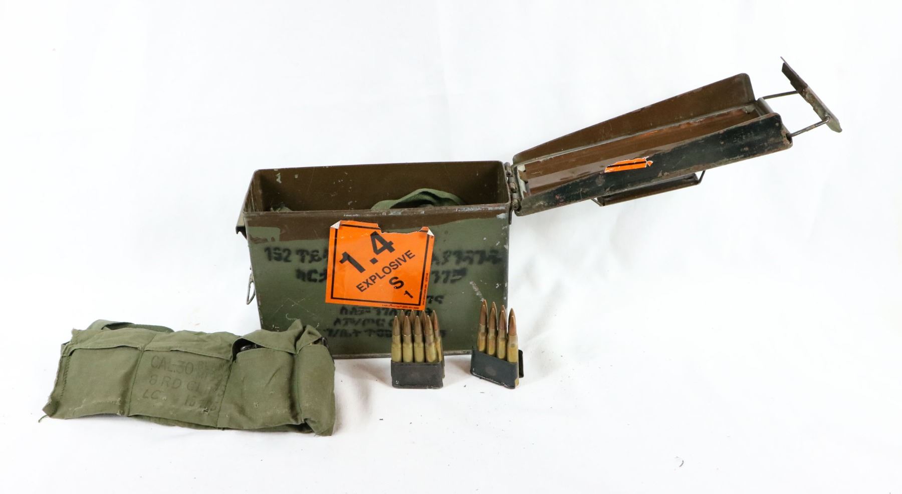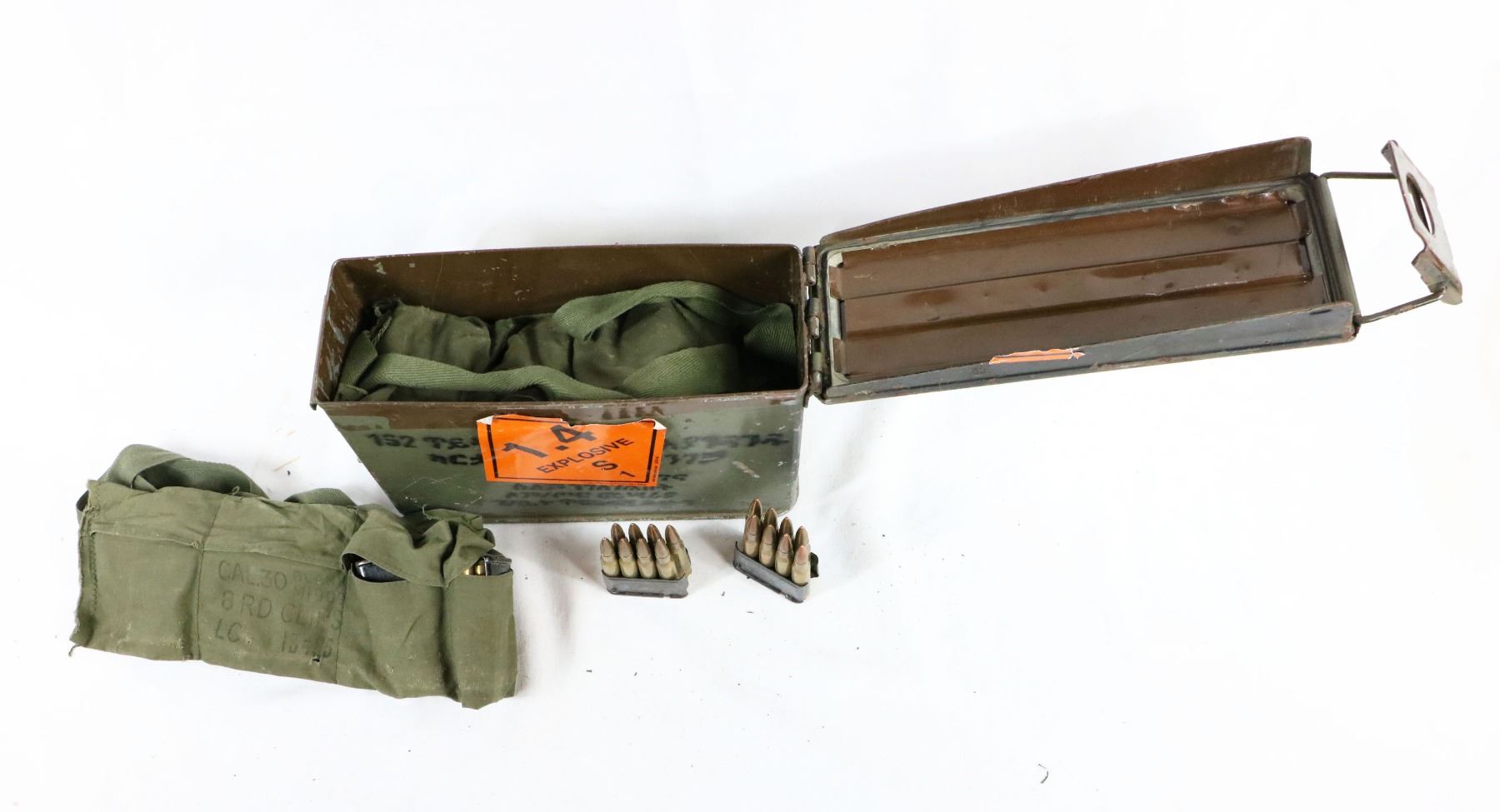 Ammo comes in M1 Garand en-bloc clips, with six clips to a bandoleer. There is four bandoleers of ammo, bandoleers are worn. Ammo is in good condition, see photos.