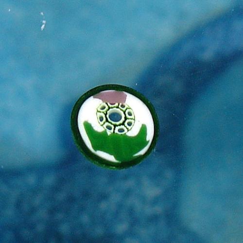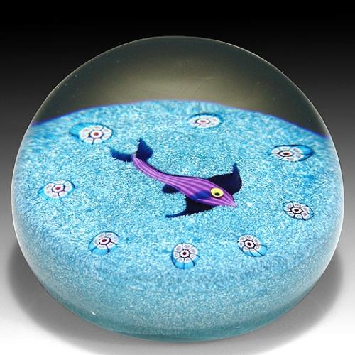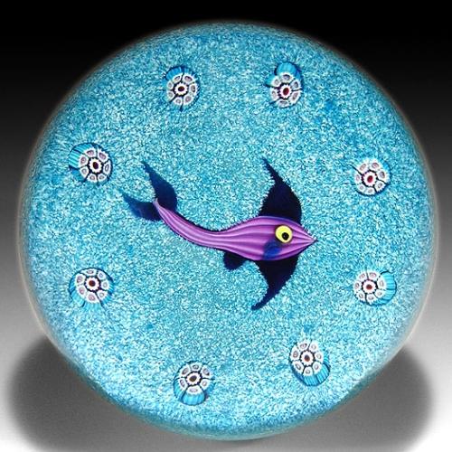 Scotia, Paul Ysart-style, fish on jasper ground paperweight, containing a flat purple fish, with cobalt blue fins and tail, encircled by a spaced ring of complex canes, on blue and white jasper ground. Scotia pink thistle signature cane on the base. "Scotia" and "Made in Scotland" stickers. Diameter 2 7/8". NO RESERVE