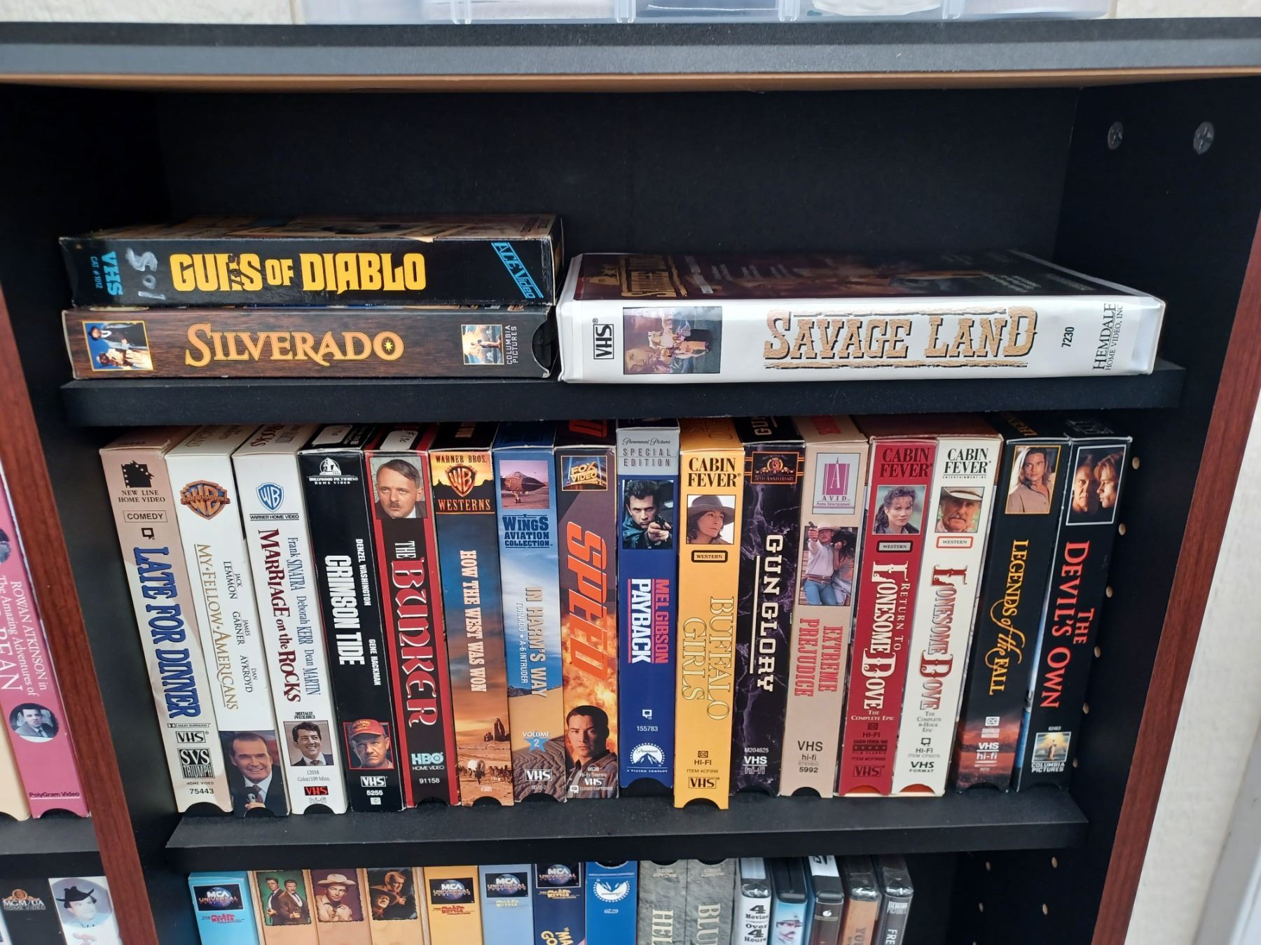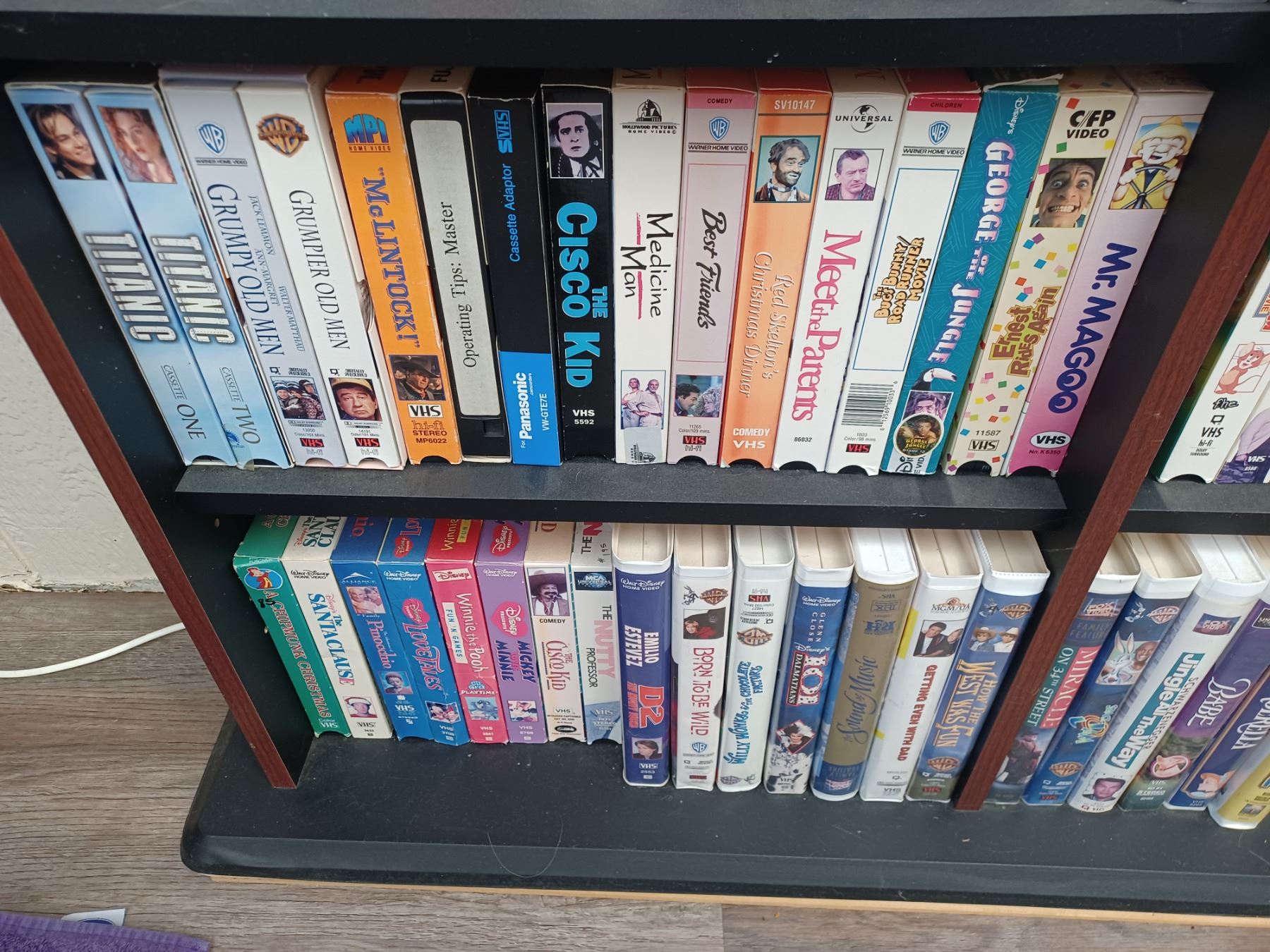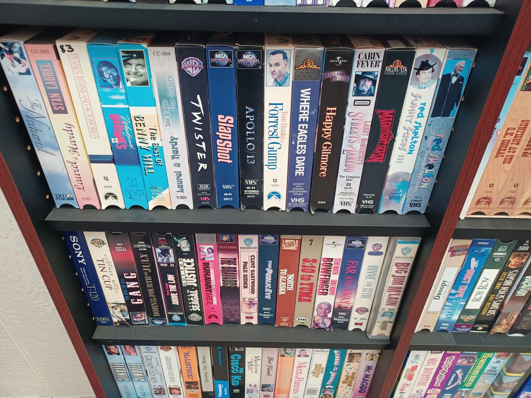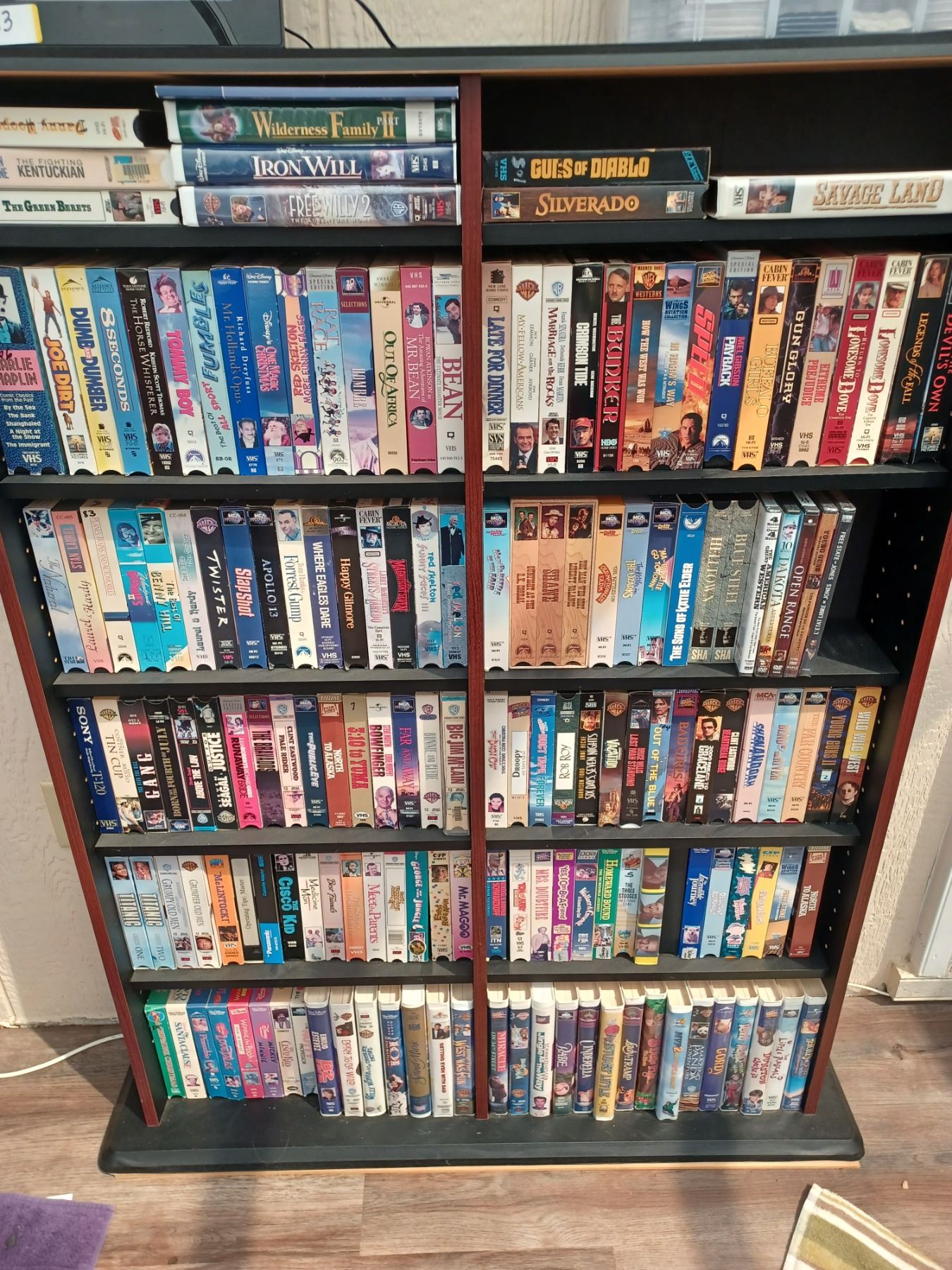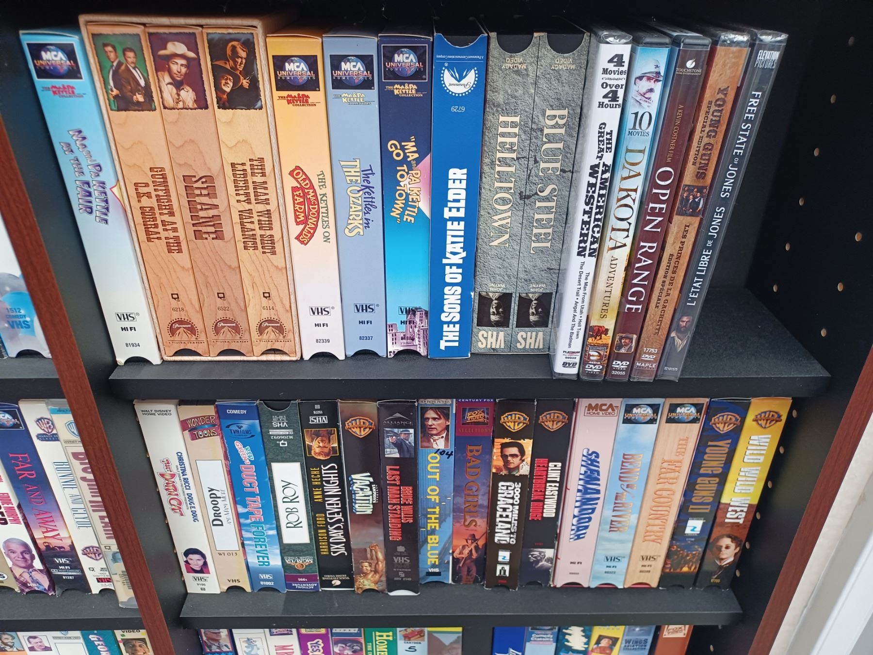150+/- VHS AND DVDS - COMES WITH SHELVING UNIT. PLEASE SEE IMAGES FOR MORE INFO