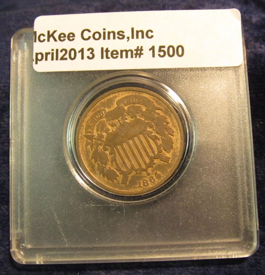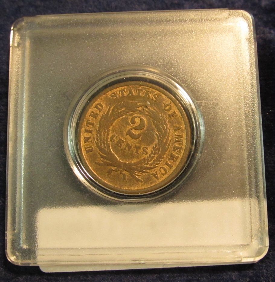 1500. 1864 U.S. Two Cent Piece. Slightly flat struck EF-AU with lots of luster. In a snaptight cases.