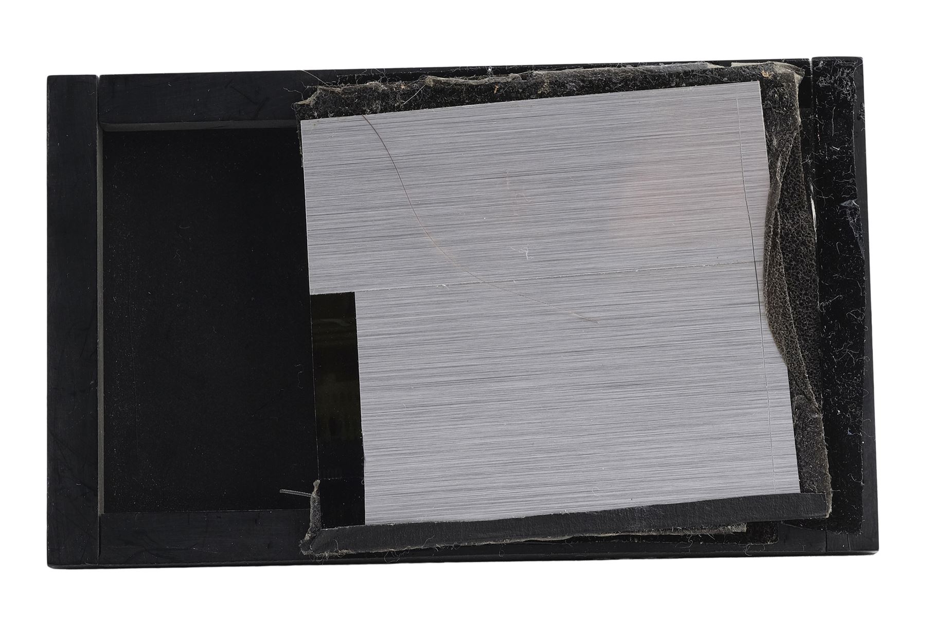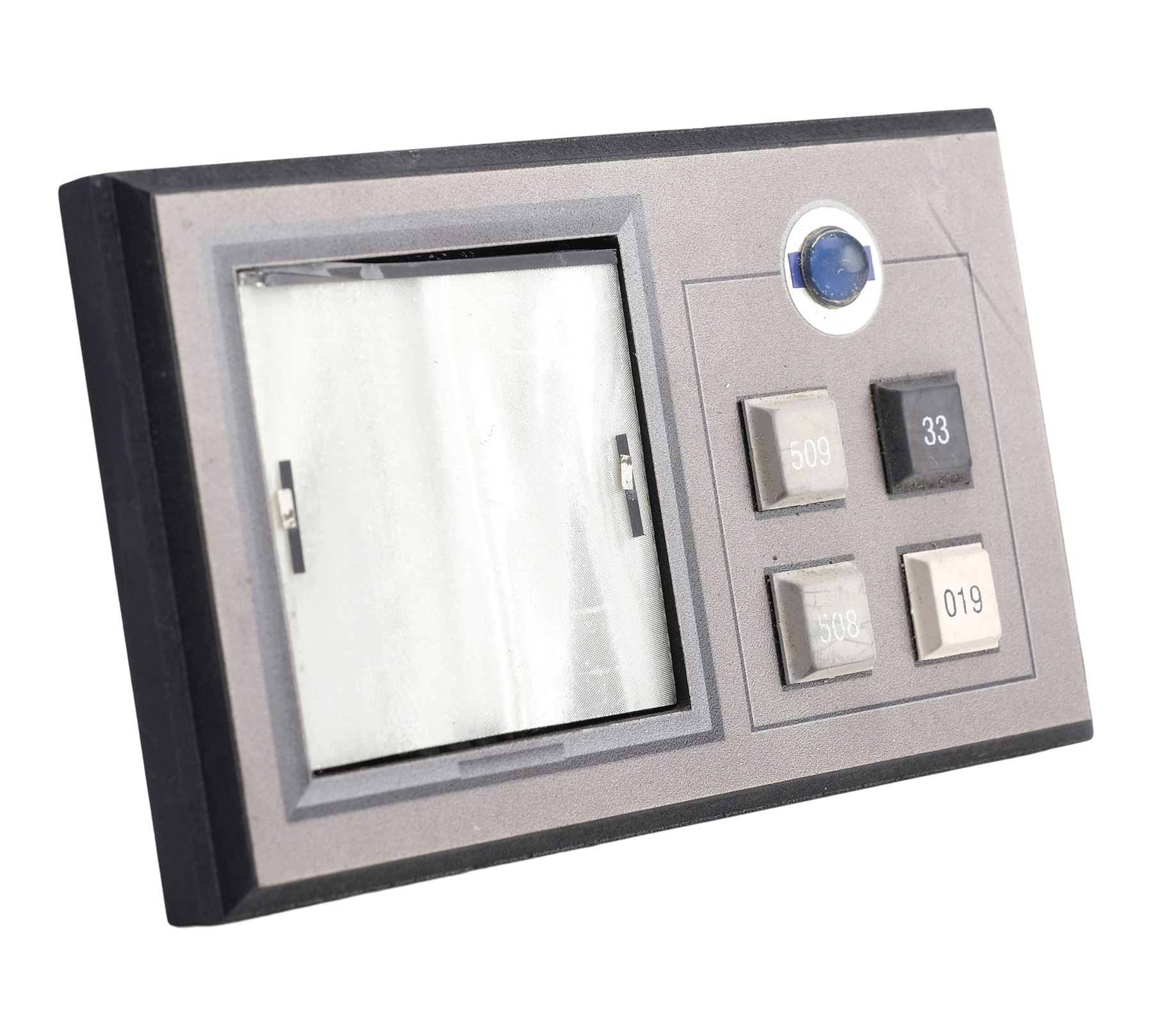 This lot comes from the collection of celebrated Star Trek franchise artists and advisors Michael and Denise Okuda. It consists of a foam board with a gray decal cover, a foam silver-color square "speaker" panel, four rubber buttons and a blue acrylic dome light. The back of the console has a sheet of metal attached to the back and contains a circuit board on the interior. This console exhibits adhesive residue on the back and a buildup of grime. Dimensions: 5" x 3" x 0.5" (12.75 cm x 7.5 cm x 1.25 cm)