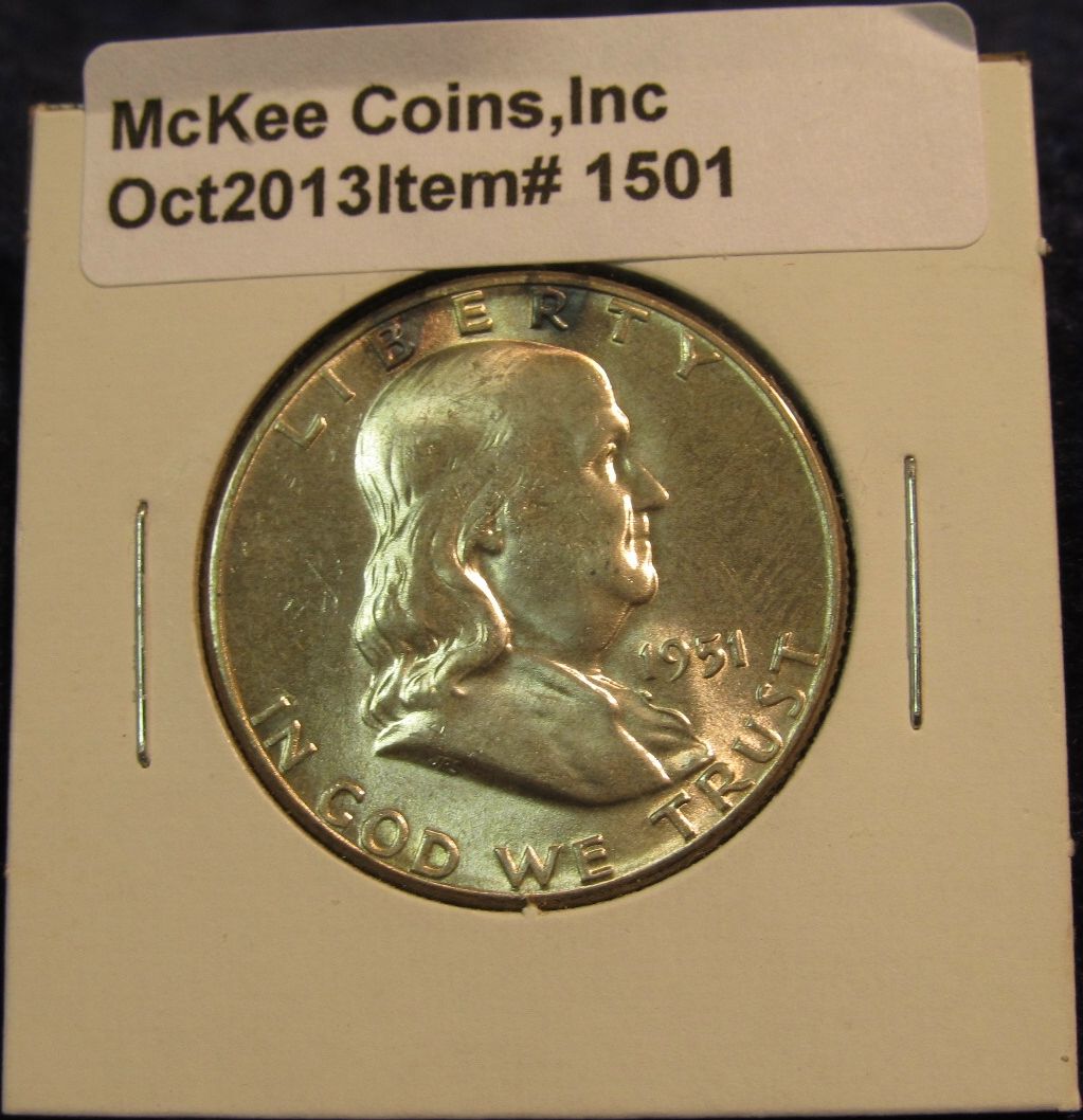 1501. 1951 P Franklin Half Dollar. Gem MS 63 with original toning and luster. Redbook value $24.00.1501