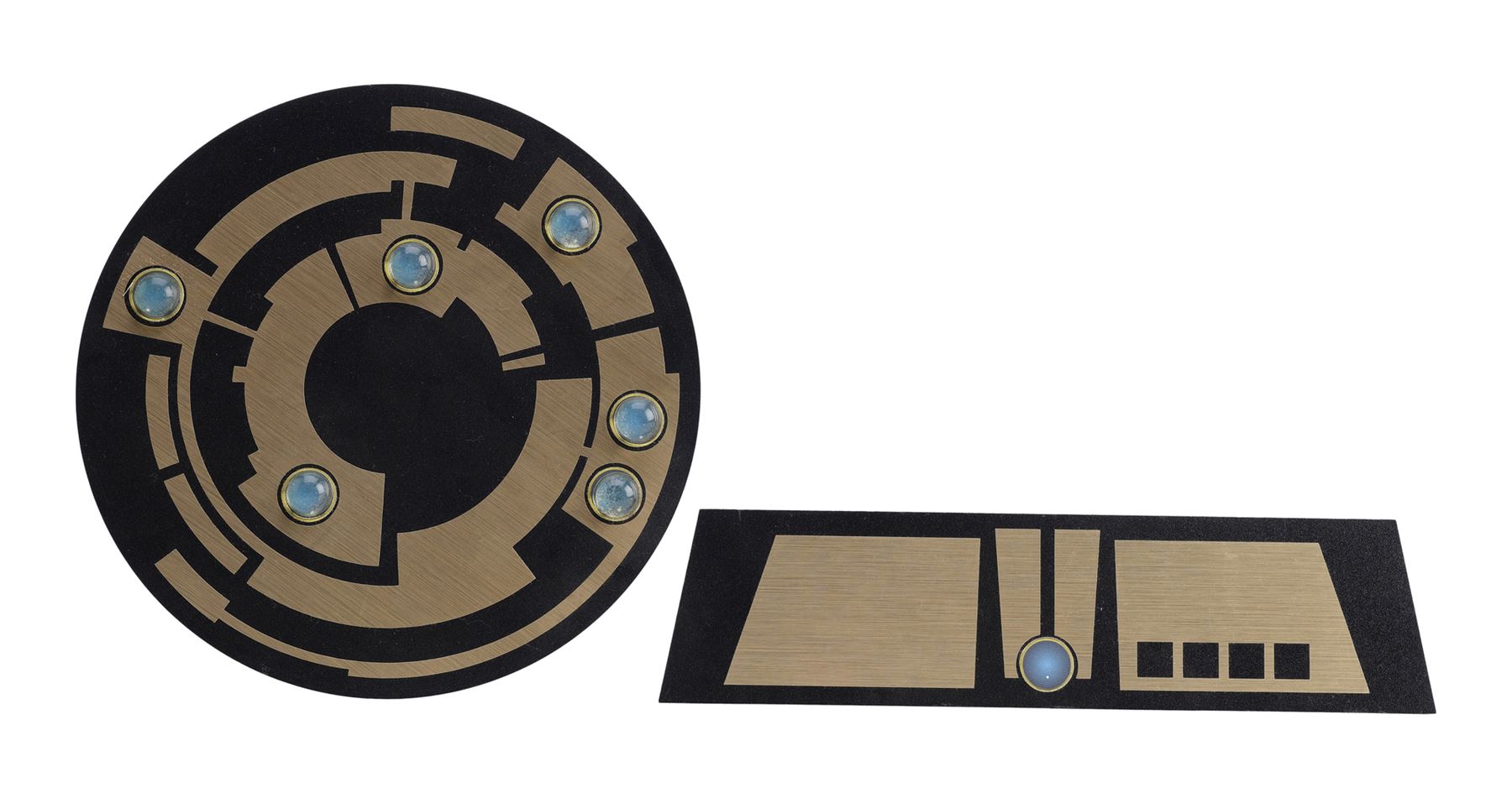 This lot comes from the collection of celebrated Star Trek franchise artists and advisors Michael and Denise Okuda. It consists of two flat polyethylene panels, one round and one trapezoidal, applied with printed futuristic golden graphics and iridescent blue silicone buttons. Both panels exhibit adhesive residue from mounting and some warping to the graphics, while one of the buttons has come loose since production. Dimensions: (largest) 10.5" x 8" x 0.5" (26.75 cm x 20.5 cm x 1.5 cm)Though their long and celebrated careers in the Star Trek world began in features, Michael and Denise Okuda established themselves as franchise legends while working on Star Trek: The Next Generation. Michael became art supervisor on TNG, while Denise came on as a scenic artist during Deep Space Nine, roles they would continue to perform through Voyager, Enterprise, and the Next Generation films. Married in 1993, the Okudas are known as the driving forces behind the development of many of the now-iconic 24th-century technologies seen throughout the series, including the famous "Okudagrams" they created for the LCARS (Library Computer Access and Retrieval System) interfaces . Propstore is proud to present a selection of key memorabilia from the personal collection of one of the franchise's most important creative teams to the public for the first time.