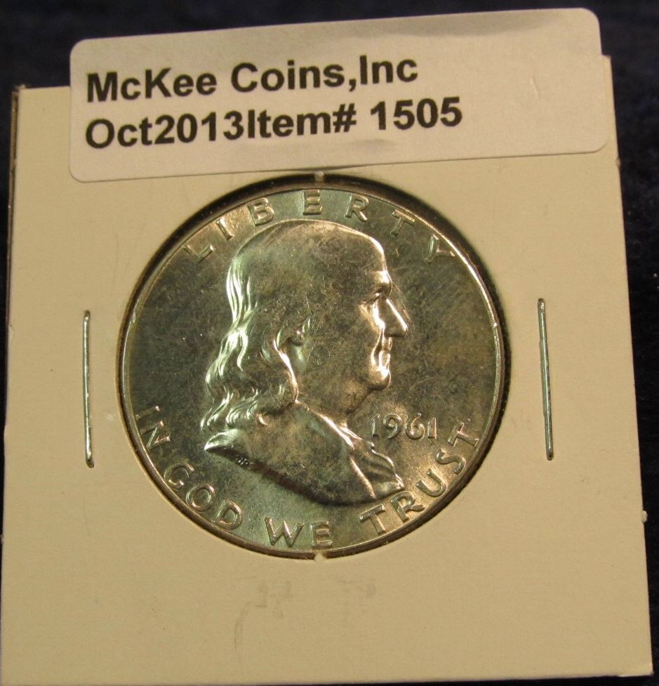 1505. 1961 P Franklin Half Dollar. Gem MS 65 with original toning and luster. Redbook value $75.00.