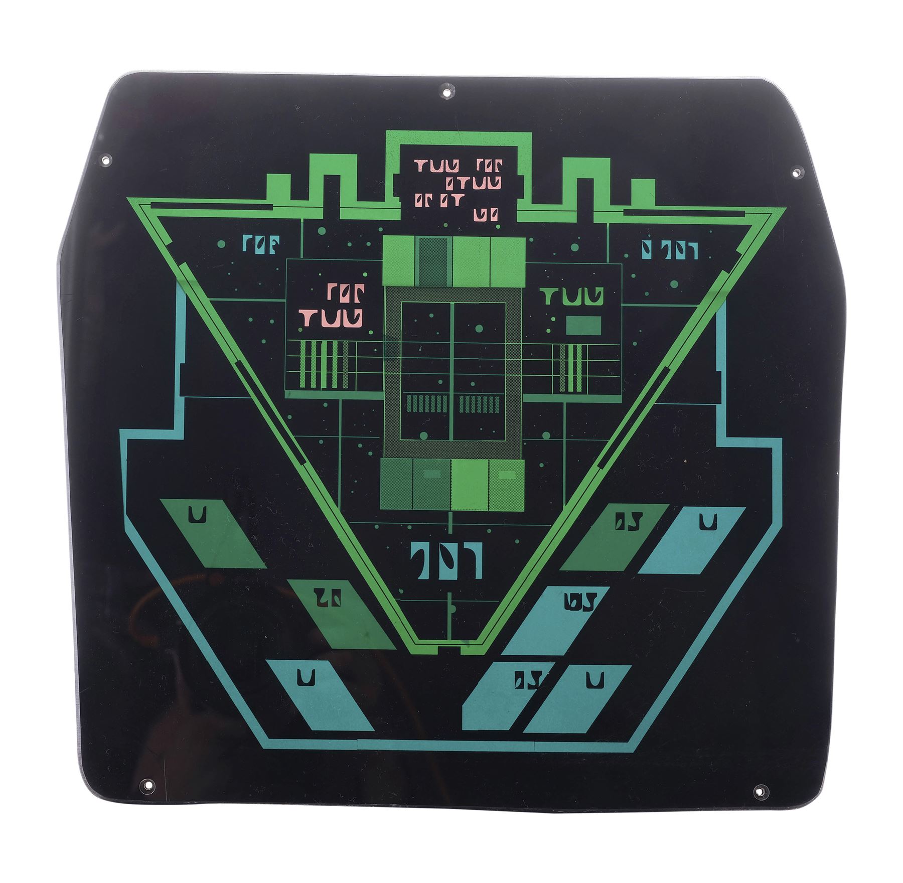 STAR TREK FRANCHISE (1966-PRESENT) - Michael and Denise Okuda Collection: Romulan Computer Panel - A Romulan computer panel from various Star Trek productions. The Romulans used their own touch-screen technology throughout various series, which were recognizable by their use of Romulan characters, triangular and parallelogram shapes, as well as the use of green colors.