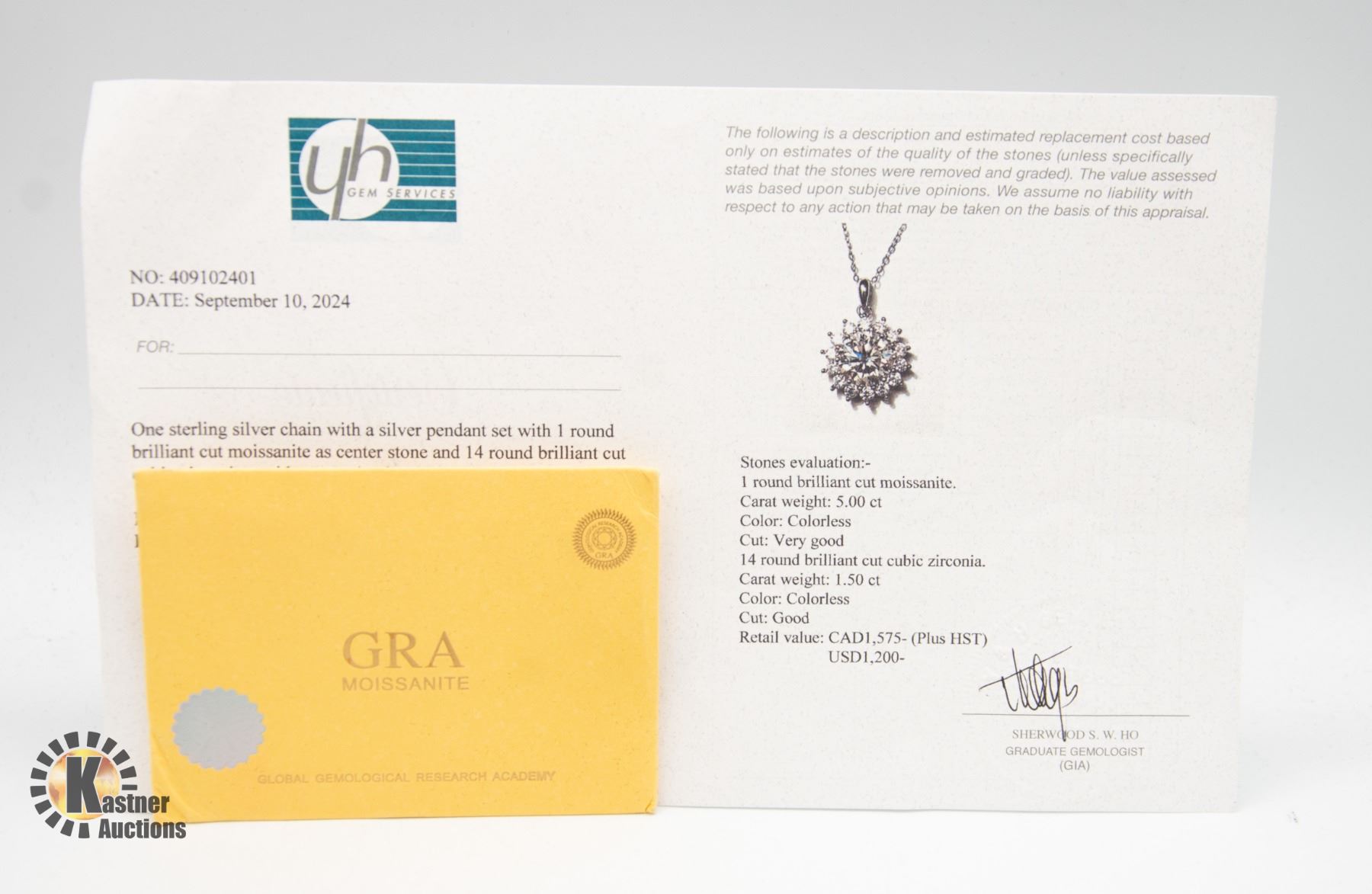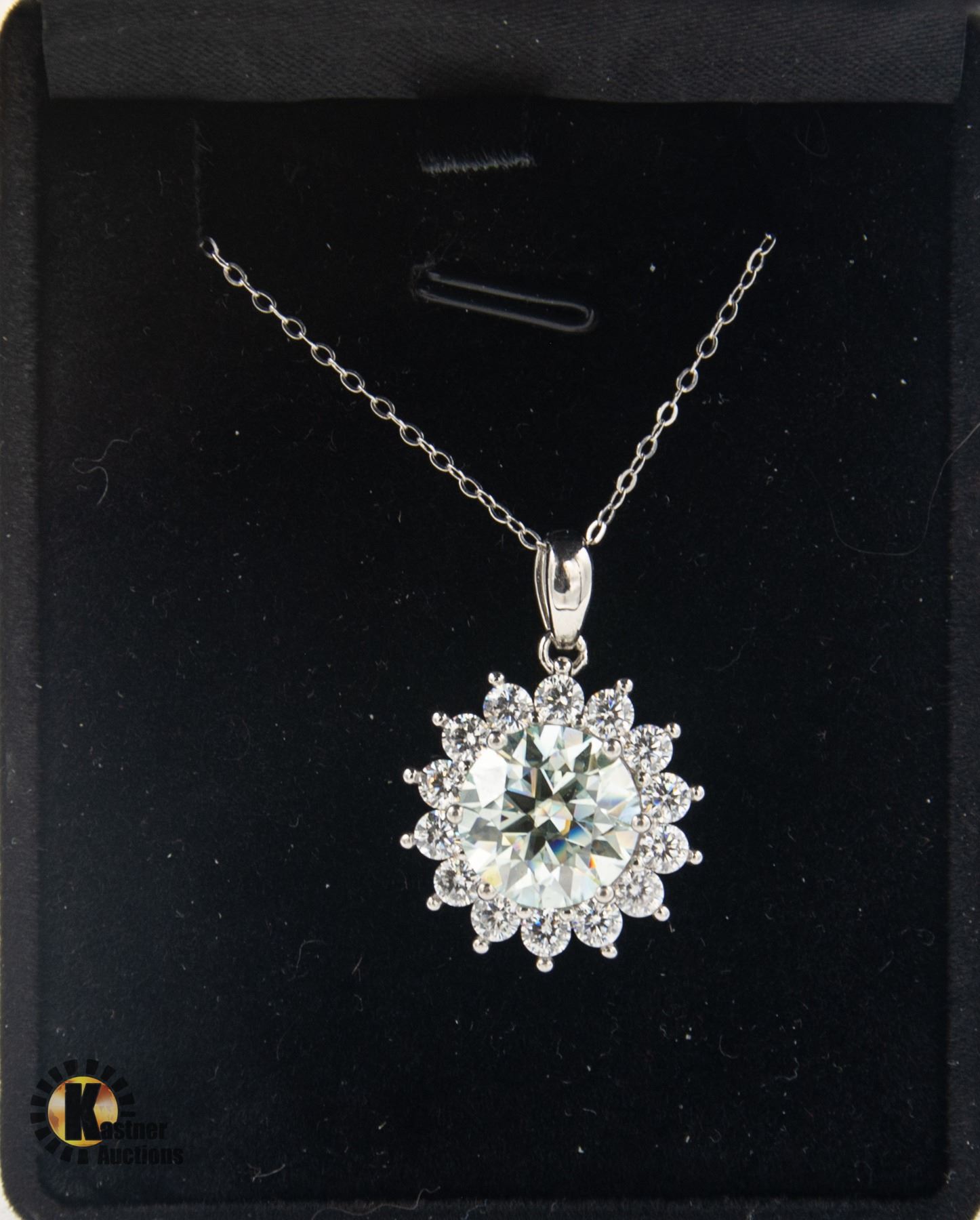 MOISSANITE STONE VVS D COLOR SET IN CENTER WITH 14 ROUND BRILLIANT CUT CUBIC ZIRCONIA, SURROUNDING THE CENTER AND WEIGHING A TOTAL 1.50 CT SET IN 925 SILVER PENDANT RETAIL VALUE $1,575.00 **ALL ITEMS MUST BE REMOVED BY 5PM SATURDAY, JANUARY 18TH 2025. ALL REMAINING ITEMS WILL BE SUBJECT TO A $6.00 PER DAY STORAGE CHARGE. ANY ITEMS REMAINING AFTER MONDAY, FEBRUARY 10TH 2025 WILL BE CONSIDERED FORFEITED. NO REFUNDS WILL BE ISSUED FOR FORFEITED ITEMS. TO SCHEDULE A PICK UP APPOINTMENT CLICK HERE