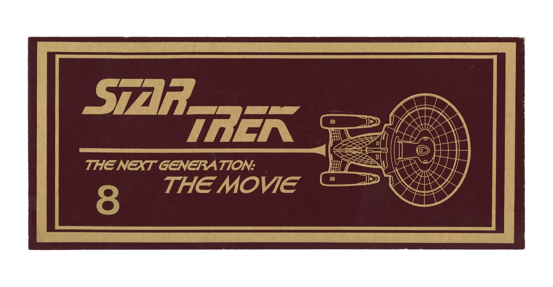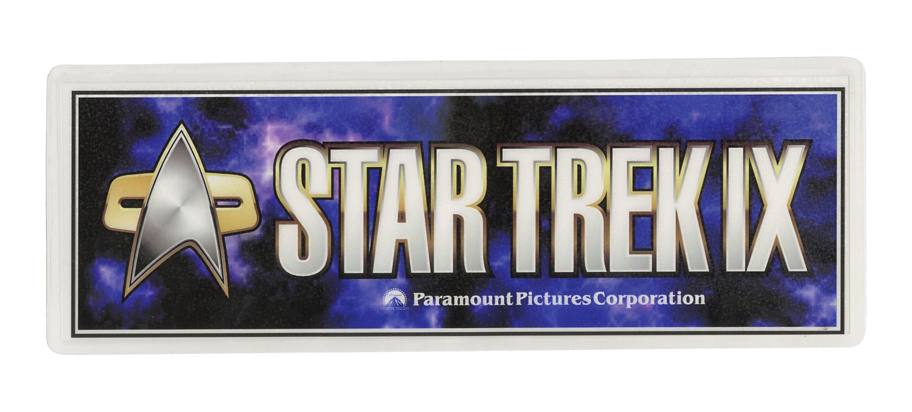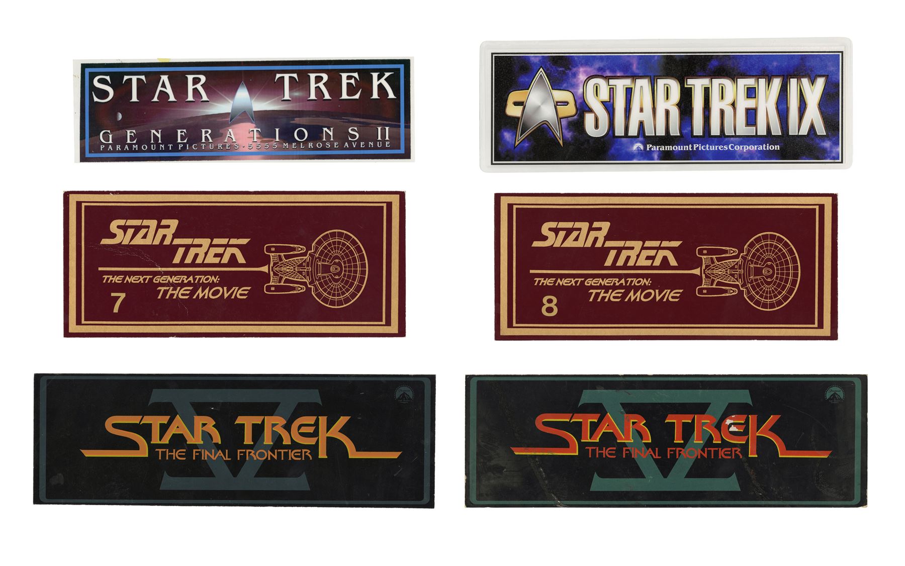 This lot comes from the collection of celebrated Star Trek franchise artists and advisors Michael and Denise Okuda. It consists of six color-printed thick cardstock parking passes: two from Star Trek V: The Final Frontier, two from Star Trek: Generations (then titled "Star Trek: the Next Generation: The Movie"), one from Star Trek: First Contact (the titled "Star Trek: Generations II"), and one from Star Trek: Insurrection (then titled "Star Trek IX"). The latter two passes are laminated. The passes exhibit minor scratching, creasing, and edge wear. Dimensions: (largest) 15.5" x 6" (39.5 cm x 15.25 cm)Though their long and celebrated careers in the Star Trek world began in features, Michael and Denise Okuda established themselves as franchise legends while working on Star Trek: The Next Generation. Michael became art supervisor on TNG, while Denise came on as a scenic artist during Deep Space Nine, roles they would continue to perform through Voyager, Enterprise, and the Next Generation films. Married in 1993, the Okudas are known as the driving forces behind the development of many of the now-iconic 24th-century technologies seen throughout the series, including the famous "Okudagrams" they created for the LCARS (Library Computer Access and Retrieval System) interfaces . Propstore is proud to present a selection of key memorabilia from the personal collection of one of the franchise's most important creative teams to the public for the first time.