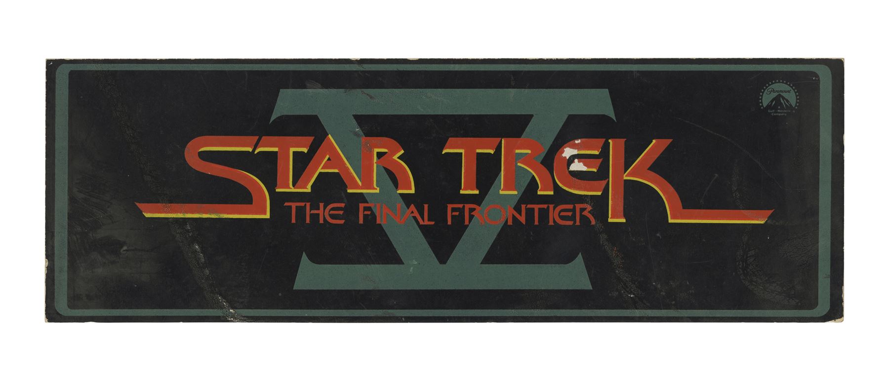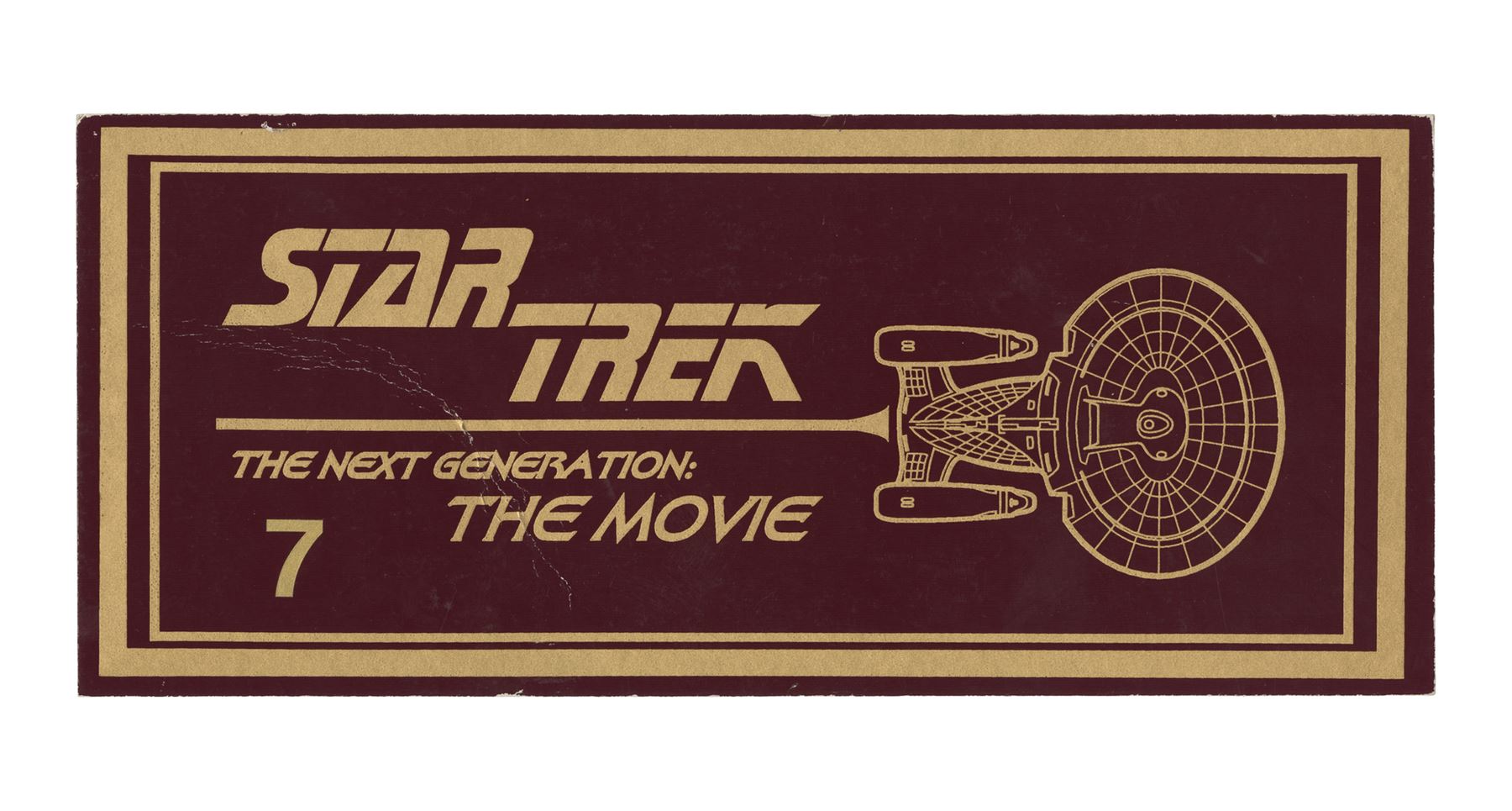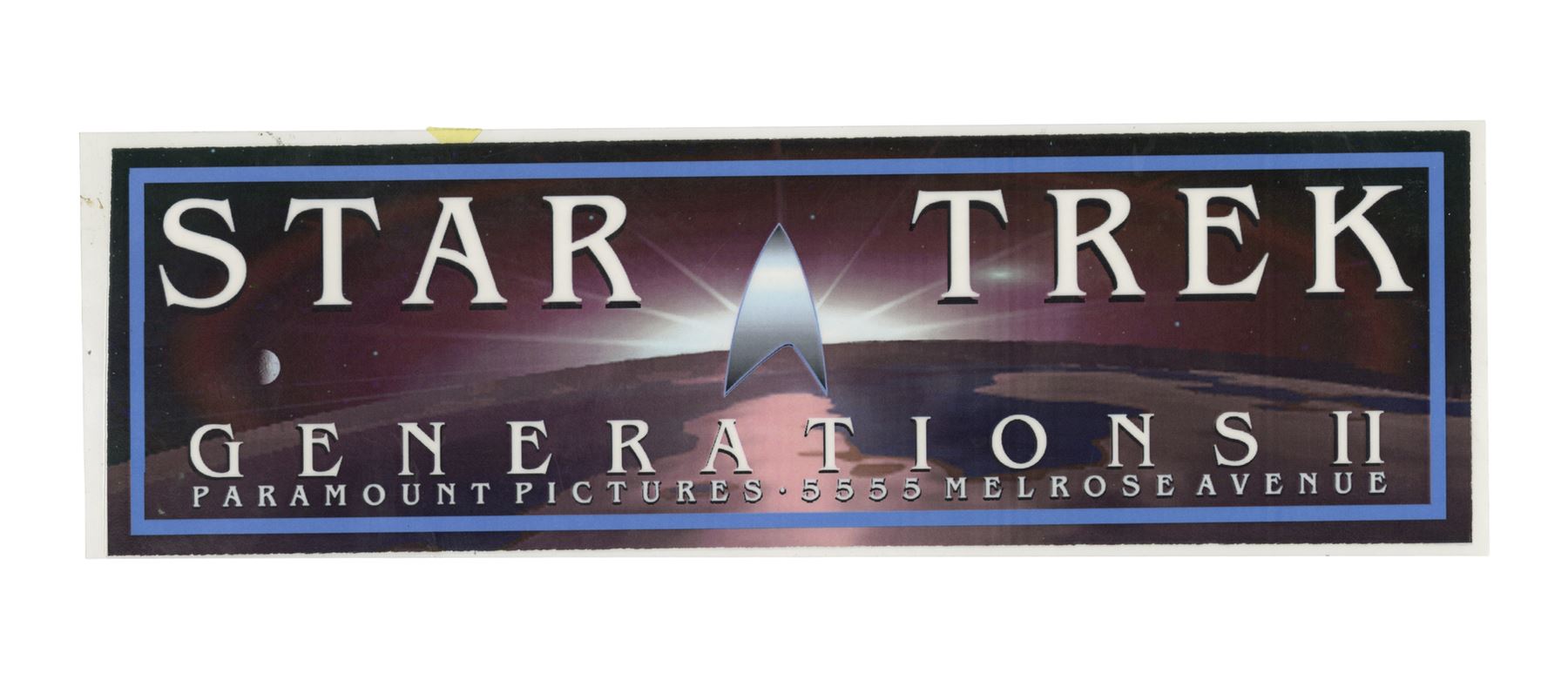 This lot comes from the collection of celebrated Star Trek franchise artists and advisors Michael and Denise Okuda. It consists of six color-printed thick cardstock parking passes: two from Star Trek V: The Final Frontier, two from Star Trek: Generations (then titled "Star Trek: the Next Generation: The Movie"), one from Star Trek: First Contact (the titled "Star Trek: Generations II"), and one from Star Trek: Insurrection (then titled "Star Trek IX"). The latter two passes are laminated. The passes exhibit minor scratching, creasing, and edge wear. Dimensions: (largest) 15.5" x 6" (39.5 cm x 15.25 cm)Though their long and celebrated careers in the Star Trek world began in features, Michael and Denise Okuda established themselves as franchise legends while working on Star Trek: The Next Generation. Michael became art supervisor on TNG, while Denise came on as a scenic artist during Deep Space Nine, roles they would continue to perform through Voyager, Enterprise, and the Next Generation films. Married in 1993, the Okudas are known as the driving forces behind the development of many of the now-iconic 24th-century technologies seen throughout the series, including the famous "Okudagrams" they created for the LCARS (Library Computer Access and Retrieval System) interfaces . Propstore is proud to present a selection of key memorabilia from the personal collection of one of the franchise's most important creative teams to the public for the first time.