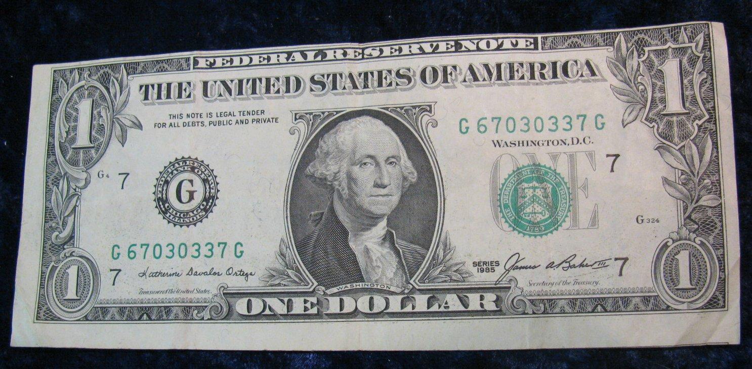 1510. Series 1985 $1.00 Federal Reserve Note. Offcenter. VF.
