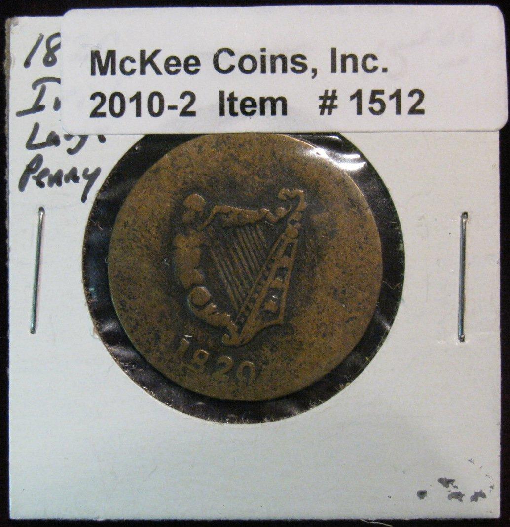 1512. 1820 Irish Large Penny Token. Depicts harp & King's Bust.