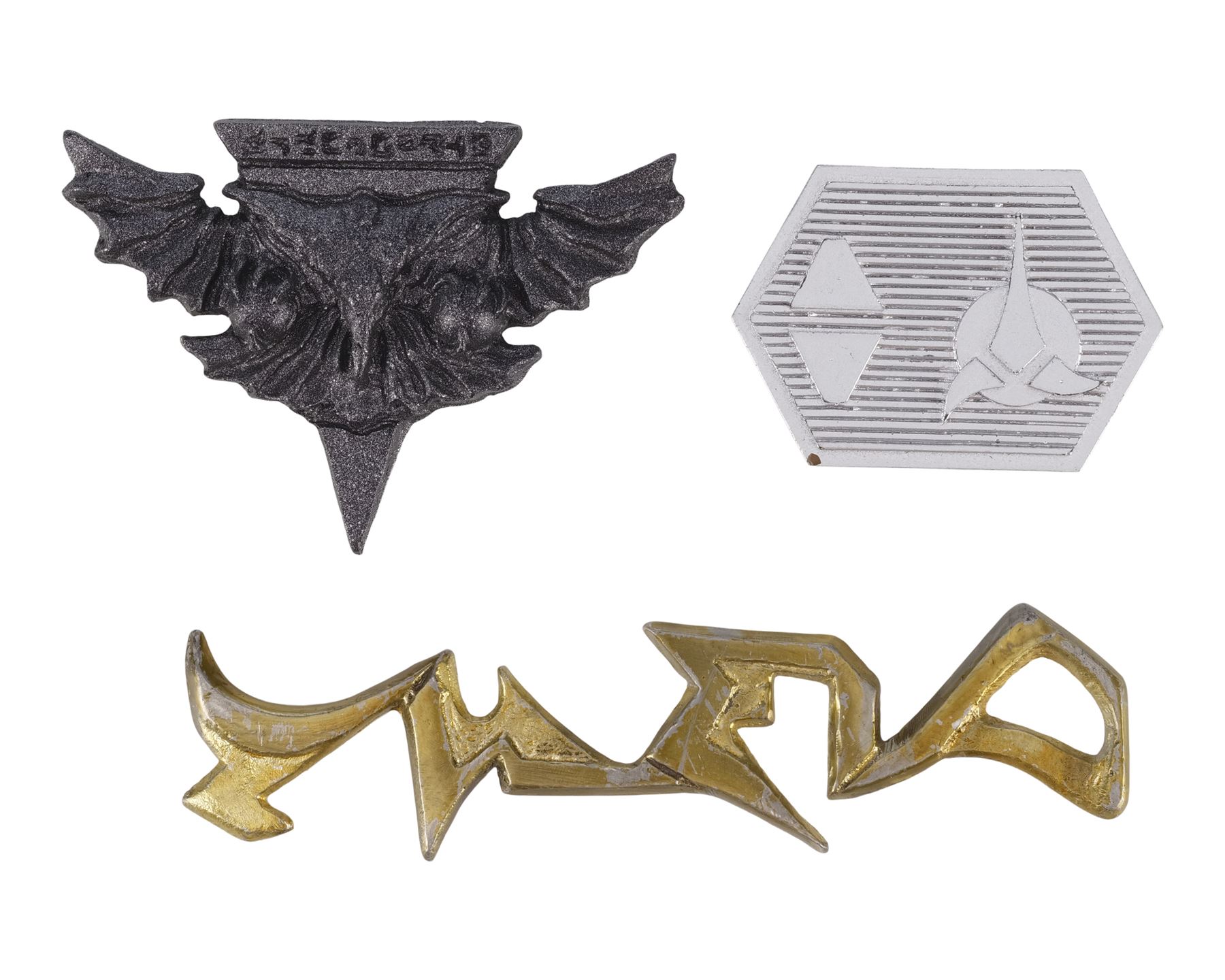 This lot, which comes from the collection of celebrated Star Trek franchise artists and advisors Michael and Denise Okuda, consists of two badges: a gold-color metal badge with Klingon language writing and a gray resin hexagonal badge with the iconic Klingon insignia; and a resin Romulan Eagle emblem painted metallic gray with a fastening strip on the back. Both Klingon badges exhibit chipping.Though their long and celebrated careers in the Star Trek world began in features, Michael and Denise Okuda established themselves as franchise legends while working on Star Trek: The Next Generation. Michael became art supervisor on TNG, while Denise came on as a scenic artist during Deep Space Nine, roles they would continue to perform through Voyager, Enterprise, and the Next Generation films. Married in 1993, the Okudas are known as the driving forces behind the development of many of the now-iconic 24th-century technologies seen throughout the series, including the famous "Okudagrams" they created for the LCARS (Library Computer Access and Retrieval System) interfaces . Propstore is proud to present a selection of key memorabilia from the personal collection of one of the franchise's most important creative teams to the public for the first time.