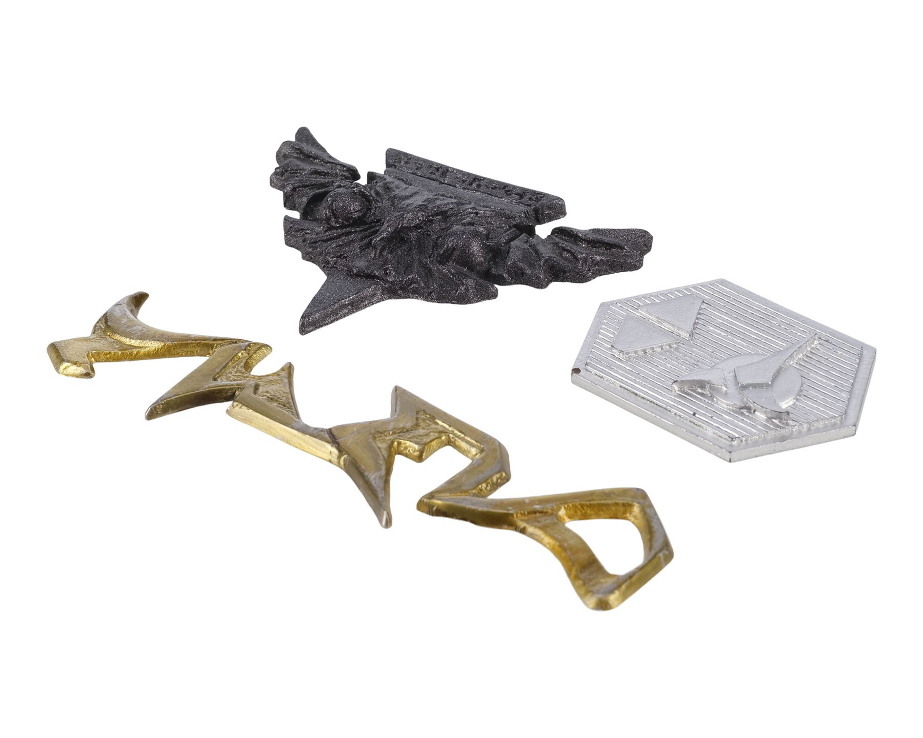 STAR TREK FRANCHISE (1966-PRESENT) - Michael and Denise Okuda Collection: Pair of Klingon Badges with Romulan Emblem - A pair of Klingon badges with a Romulan emblem from the Star Trek franchise. Beginning with the Klingon's uniform redesign in Leonard Nimoy's Star Trek III: The Search for Spock and continuing through subsequent films and series, Klingon warriors typically wore a Klingon glyph badge on their gauntlets and a small hexagonal communicator badge on their sleeves. Romulans similarly wore emblems of the Romulan Star Empire on their uniforms.