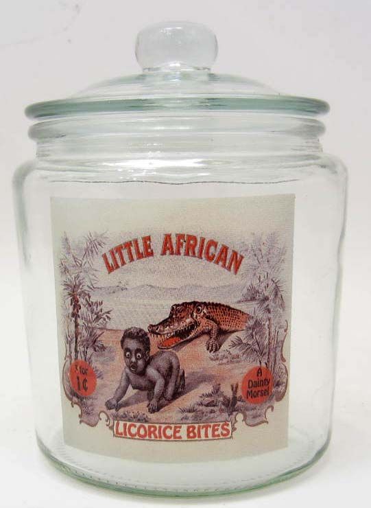 15196 - BLACK AMERICAN LITTLE AFRICA SMALL GLASS ADVERTISING COUNTER JAR
