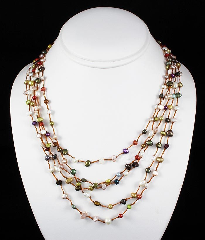 19 inches Multi-color 5 Strand Thread Freshwater Pearl Necklace w/ Botton Lock