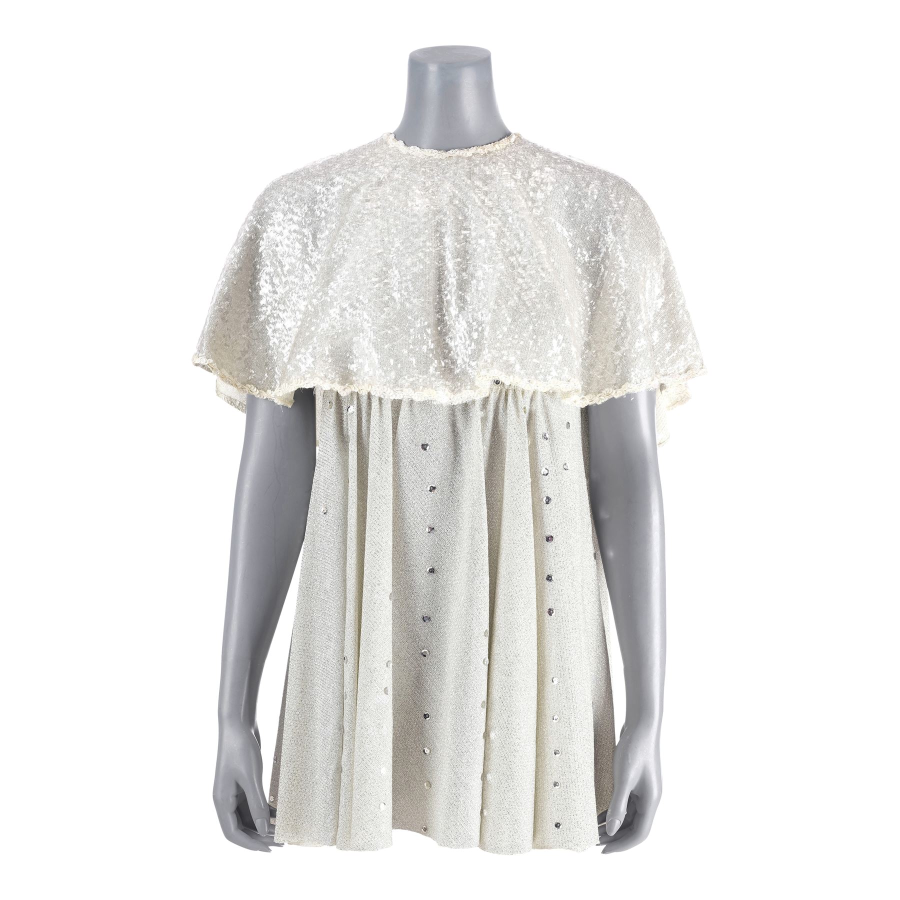 Custom-made for the production, the garment is cut from a metallic silver-color fabric and consists of a dress with a layered piece adhered to the neckline. Silver-color sequins embellish the dress, and the neckpiece features a layer of transparent plastic material with a pearlescent sequin trim. The back of the dress features an opening with a hook-and-eye fastening at the top. A cream-color waistband is adhered to the interior and the name "Susan"' has been written in black ink on the band. This smock dress exhibits a broken hook-and-eye fastener and discoloration stains along the collar.