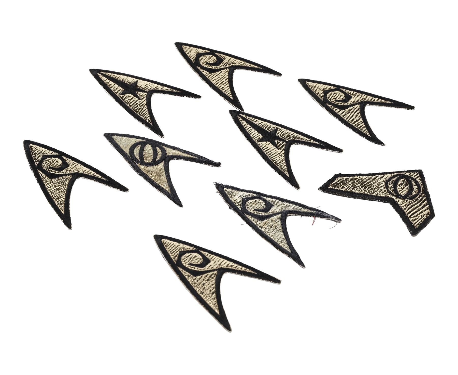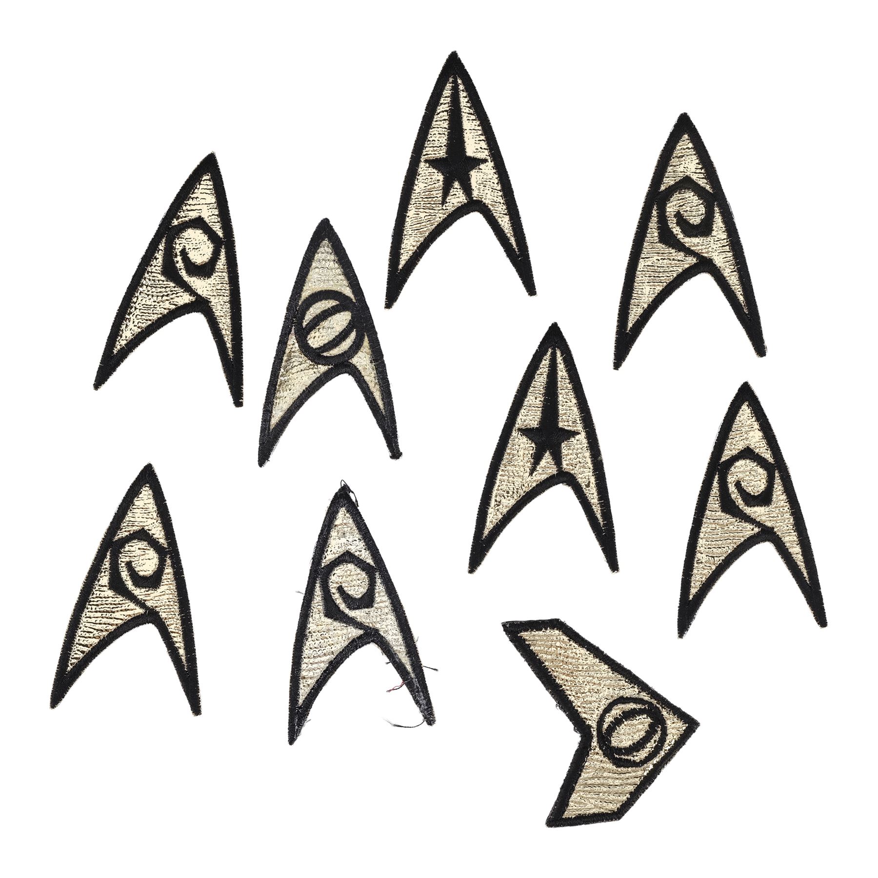This lot, from the collection of celebrated Star Trek franchise artists and advisors Michael and Denise Okuda, consists of nine black and gold-color embroidered patches. Eight are Enterprise deltas: two featuring Command-division symbols, five feature Operations symbols, and one features a Science symbol. The ninth patch features the shape unique to the Defiant with a Science division symbol in the center. They exhibit some pulled threads. Dimensions: (largest) 3.5" x 3" x 0.25" (9 cm x 7.75 cm x 0.75 cm)Though their long and celebrated careers in the Star Trek world began in features, Michael and Denise Okuda established themselves as franchise legends while working on Star Trek: The Next Generation. Michael became art supervisor on TNG, while Denise came on as a scenic artist during Deep Space Nine, roles they would continue to perform through Voyager, Enterprise, and the Next Generation films. Married in 1993, the Okudas are known as the driving forces behind the development of many of the now-iconic 24th-century technologies seen throughout the series, including the famous "Okudagrams" they created for the LCARS (Library Computer Access and Retrieval System) interfaces . Propstore is proud to present a selection of key memorabilia from the personal collection of one of the franchise's most important creative teams to the public for the first time.
