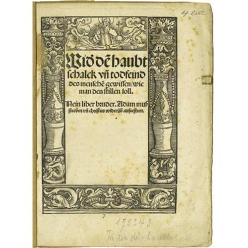 <B>1523 Sermon Attributed to Martin Luther.</B></I> Four leaves, 16mo (6” x 8”), title within woodcut border in the Holbein style, some foxing, has been mounted inside wrappers, else in very good condition. The title loosely translates as follows: Against the Main Rogue and Death Enemy: The Human Conscience and How to Overcome It. No Dear Brother, Adam Has to Die and Christ Will Be Resurrected”. <I>From the collection of Henry E. Luhrs.</B></I><BR><BR><b>Shipping:</b> Flat Material, Small (<a target="_blank" href="http://www.heritageauctions.com/common/shipping.php">view shipping information</a>)
