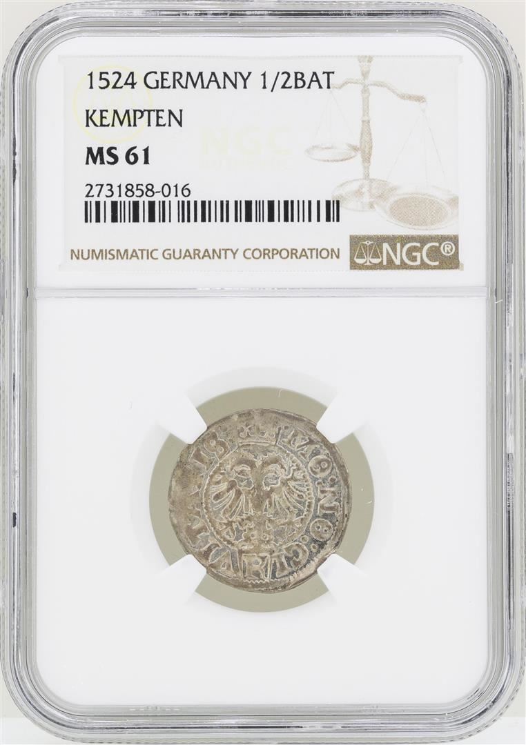 One 1524 Germany 1/2BAT Kempten Coin NGC MS61. NGC Certified.