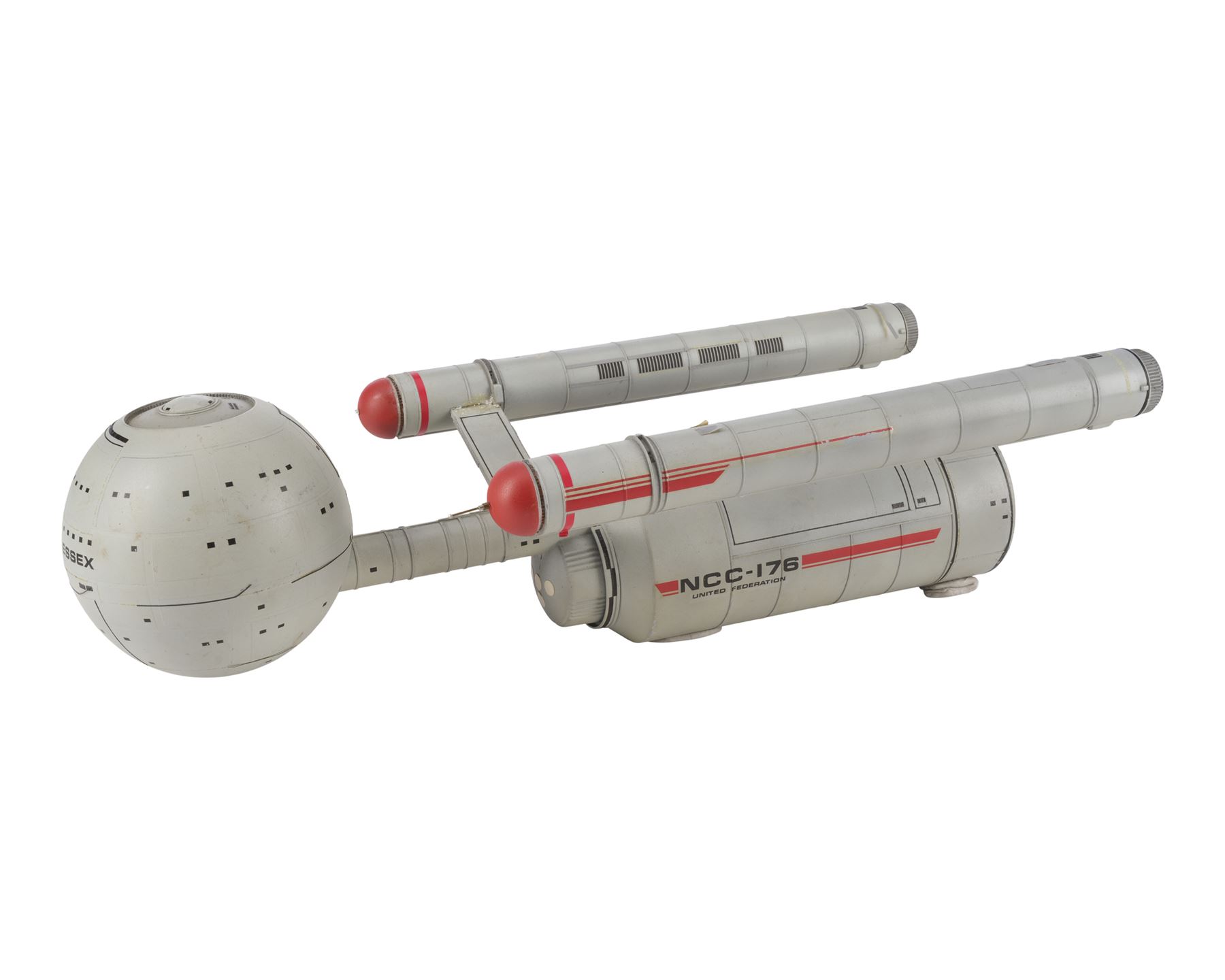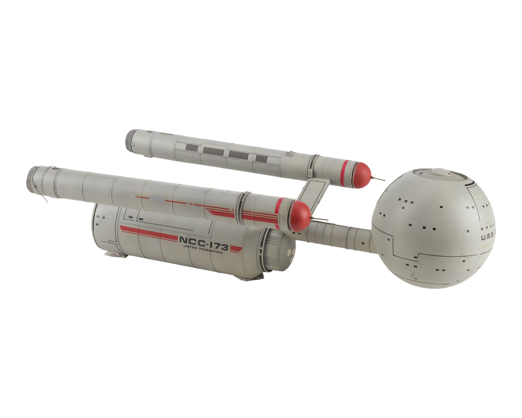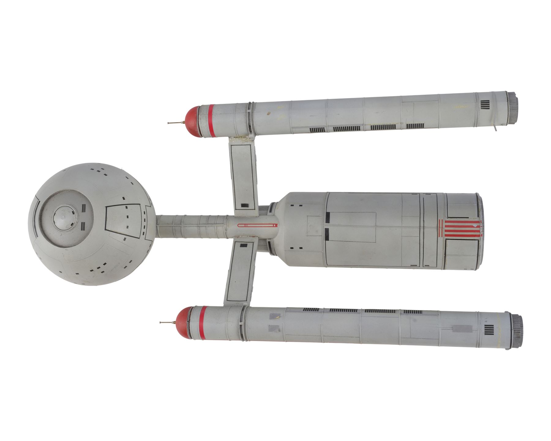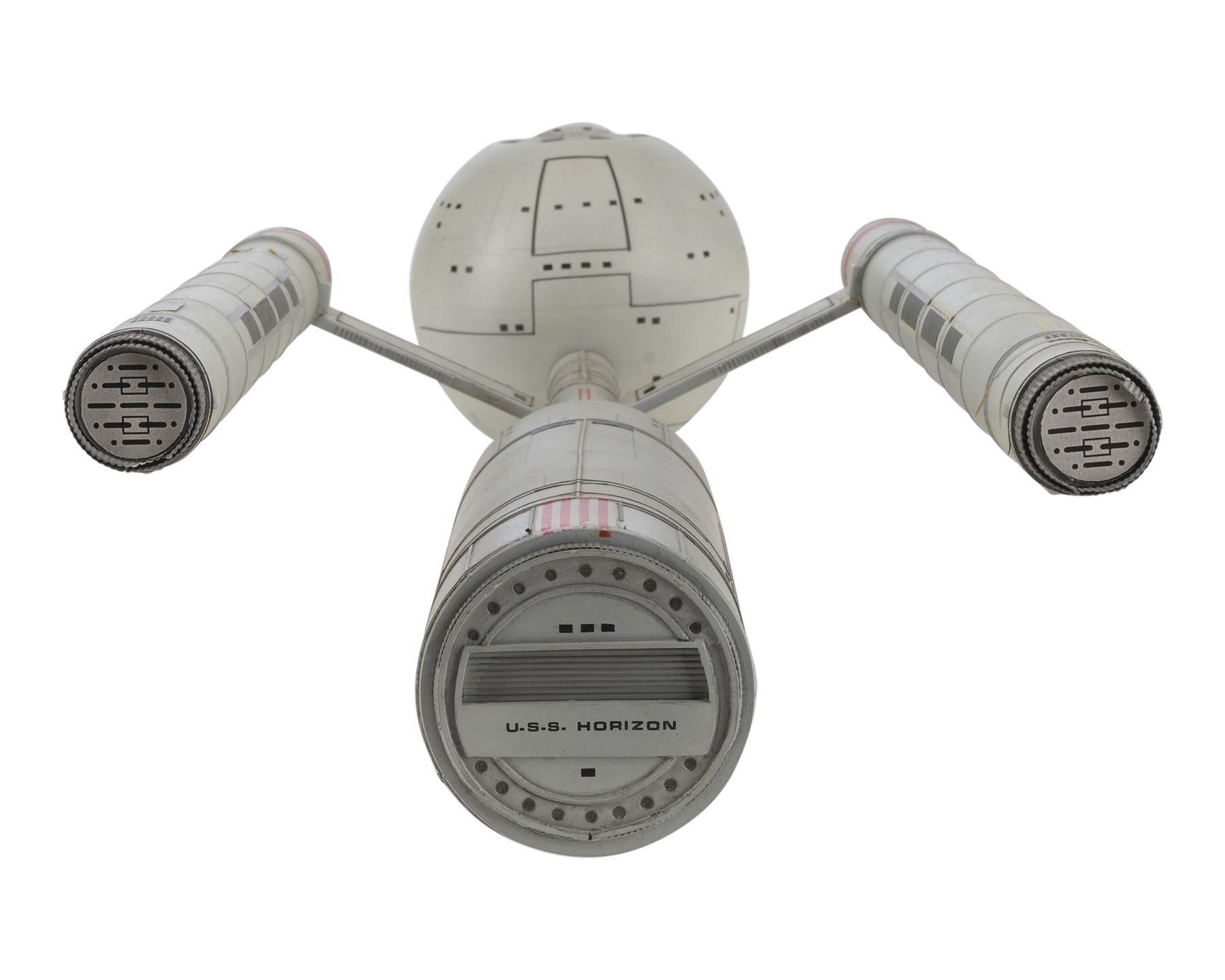 This model, which comes from the collection of celebrated Star Trek franchise artists and advisors Michael and Denise Okuda, is assembled from multiple materials, including resin, plastic, and metal, and features a spherical forward section, cylindrical hull, and two warp nacelles with pointed fronts reminiscent of the Original Series pilot Enterprise. It is painted gray with black windows and red embellishments made from graphic tape, the designation "NCC-176 United Federation," and includes a "U.S.S. Horizon" stern plate (as both vessels were of the same class). It exhibits signs of age, including staining, tape lifting, paint chipping, and adhesive residue. Dimensions: 18" x 11" x 6" (45.75 cm x 28 cm x 15.25 cm)Though their long and celebrated careers in the Star Trek world began in features, Michael and Denise Okuda established themselves as franchise legends while working on Star Trek: The Next Generation. Michael became art supervisor on TNG, while Denise came on as a scenic artist during Deep Space Nine, roles they would continue to perform through Voyager, Enterprise, and the Next Generation films. Married in 1993, the Okudas are known as the driving forces behind the development of many of the now-iconic 24th-century technologies seen throughout the series, including the famous "Okudagrams" they created for the LCARS (Library Computer Access and Retrieval System) interfaces . Propstore is proud to present a selection of key memorabilia from the personal collection of one of the franchise's most important creative teams to the public for the first time.