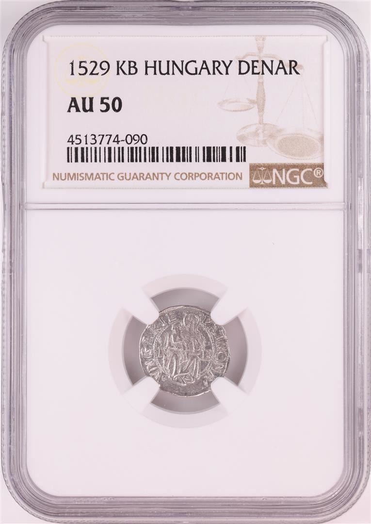 One 1529 KB Hungary Denar 'Madonna and Child' Coin NGC AU50. NGC Certified.