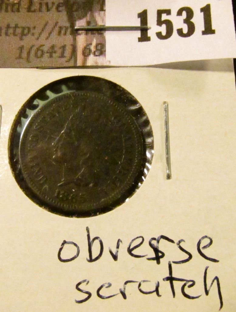 1531 . 1865 Indian Head Cent, Very Good, obverse scratch.