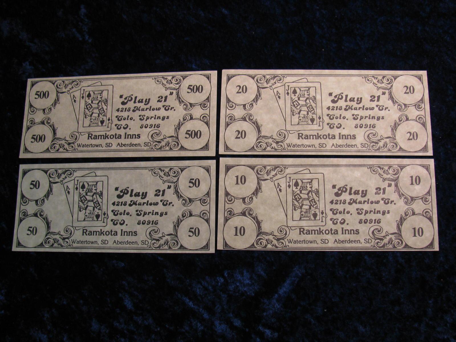 1533. Play 21. Currency, Ramkota Inns. Watertowm & Aberdeen, South Dakota. 4-Pieces. 10, 20, 50 & 500.