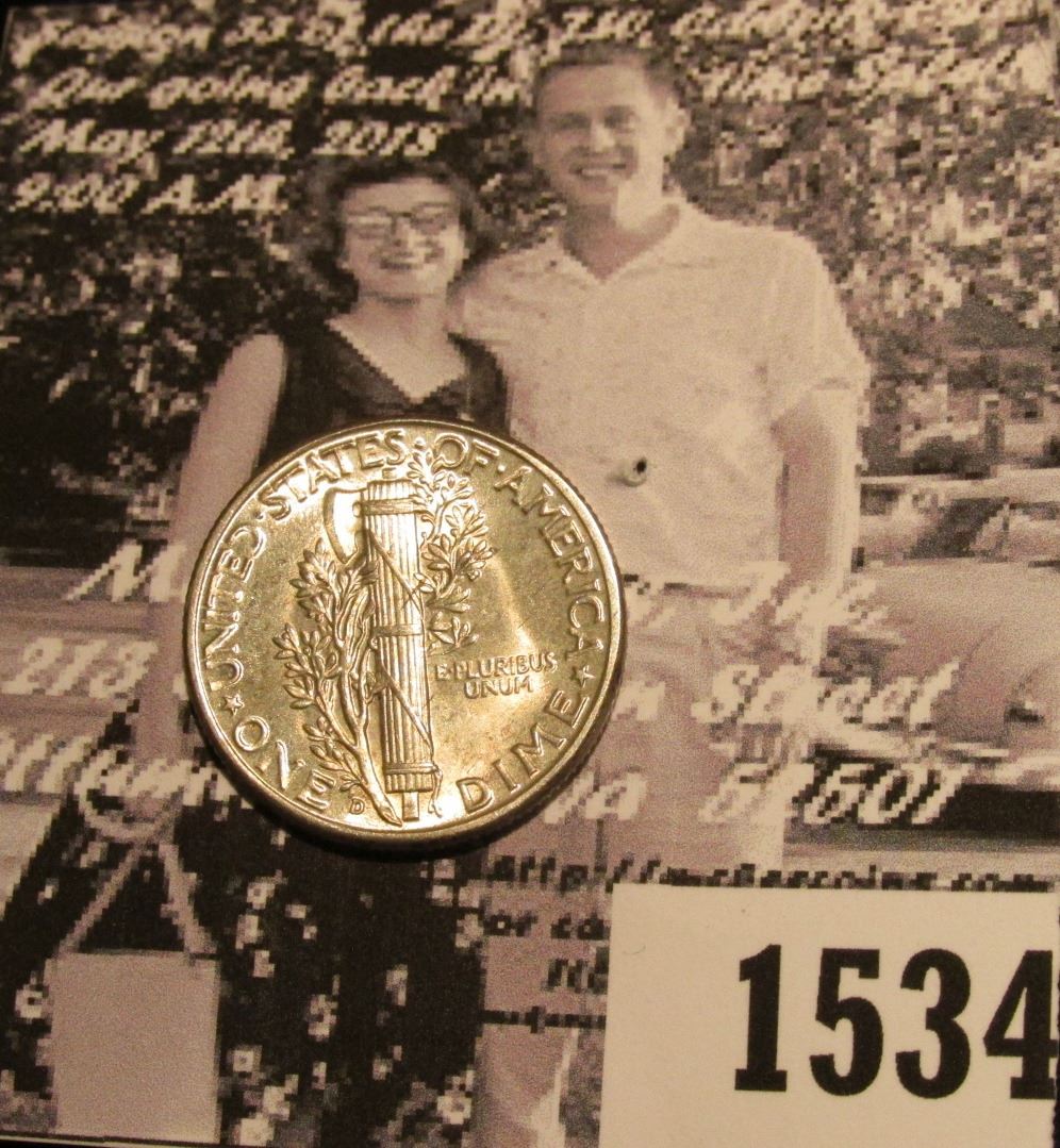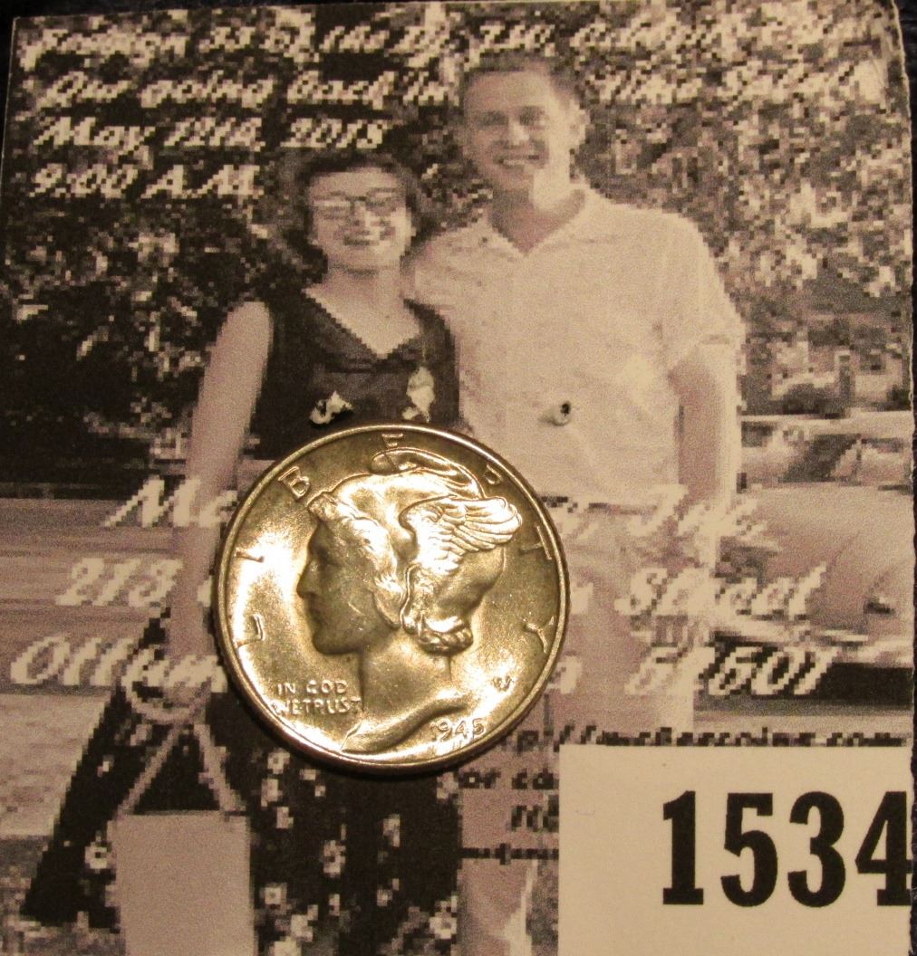 1534 . 1945 D Mercury Dime, Uncirculated with nearly full split bands.