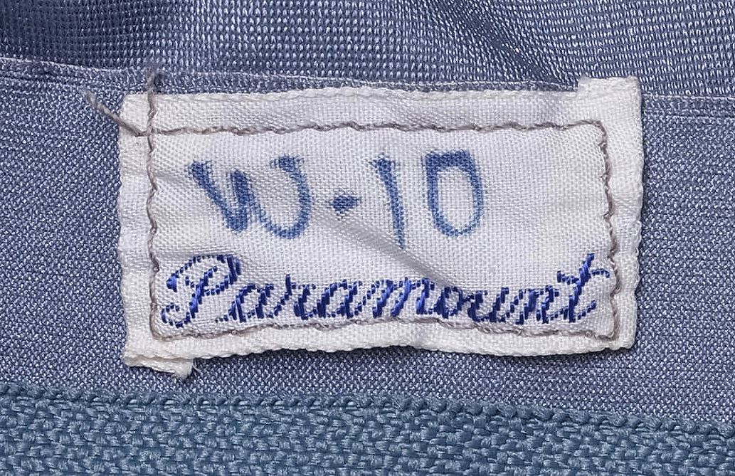 This lot consists of two zipper-backed poly-blend undershirts with ribbed collars: one long-sleeve blue undershirt with a sewn-in Paramount tag marked "W-10," and one sleeveless gray undershirt. Both exhibit some loose threads and minor discoloration from use and age.
